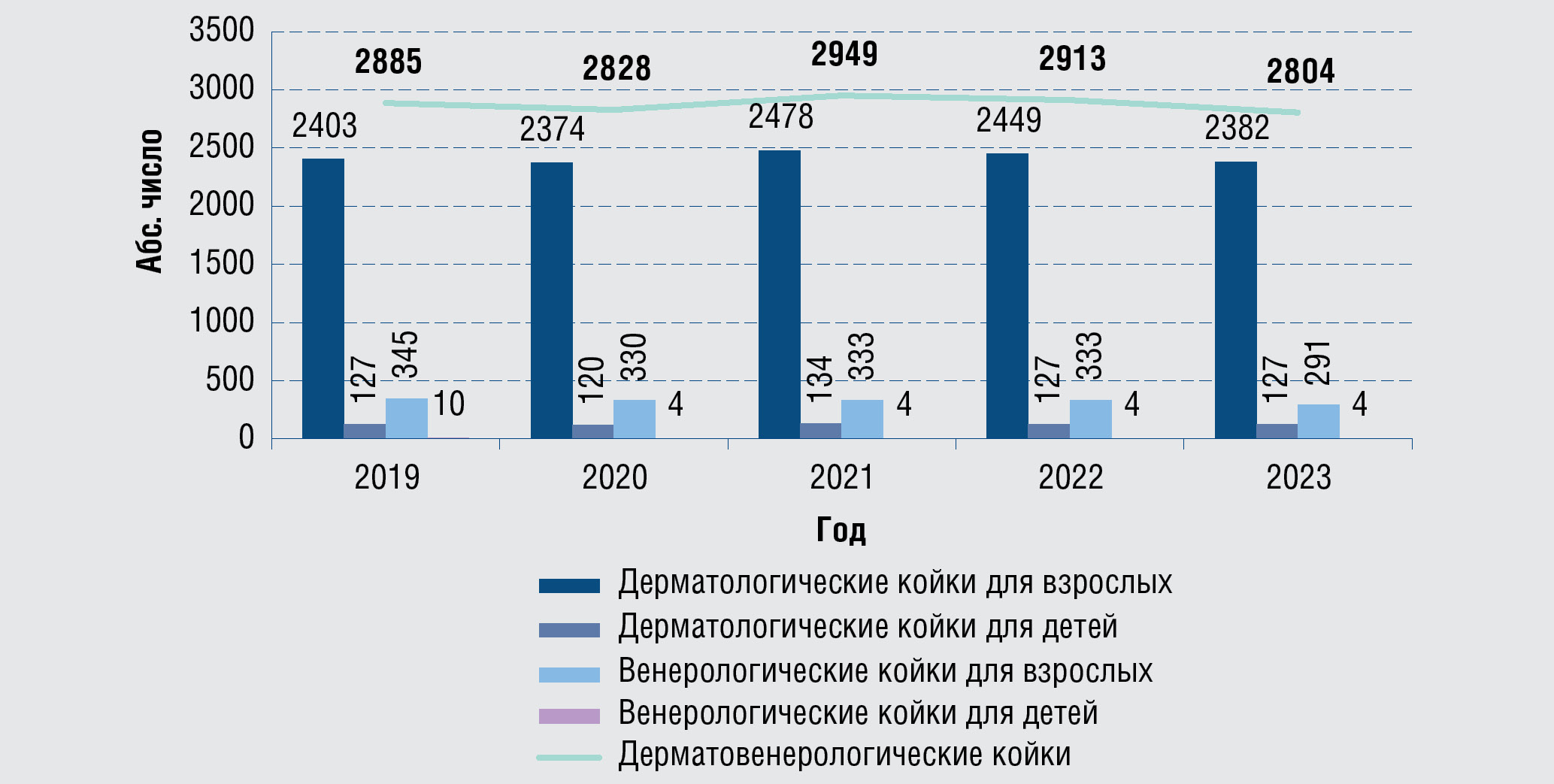Обеспеченность населения РФ дерматовенерологическими койками дневных стационаров медицинских организаций, оказывающих медицинскую помощь в стационарных условиях, в 2023 г. находилась на уровне 0, 24 на 10 тыс. населения [1, 2].