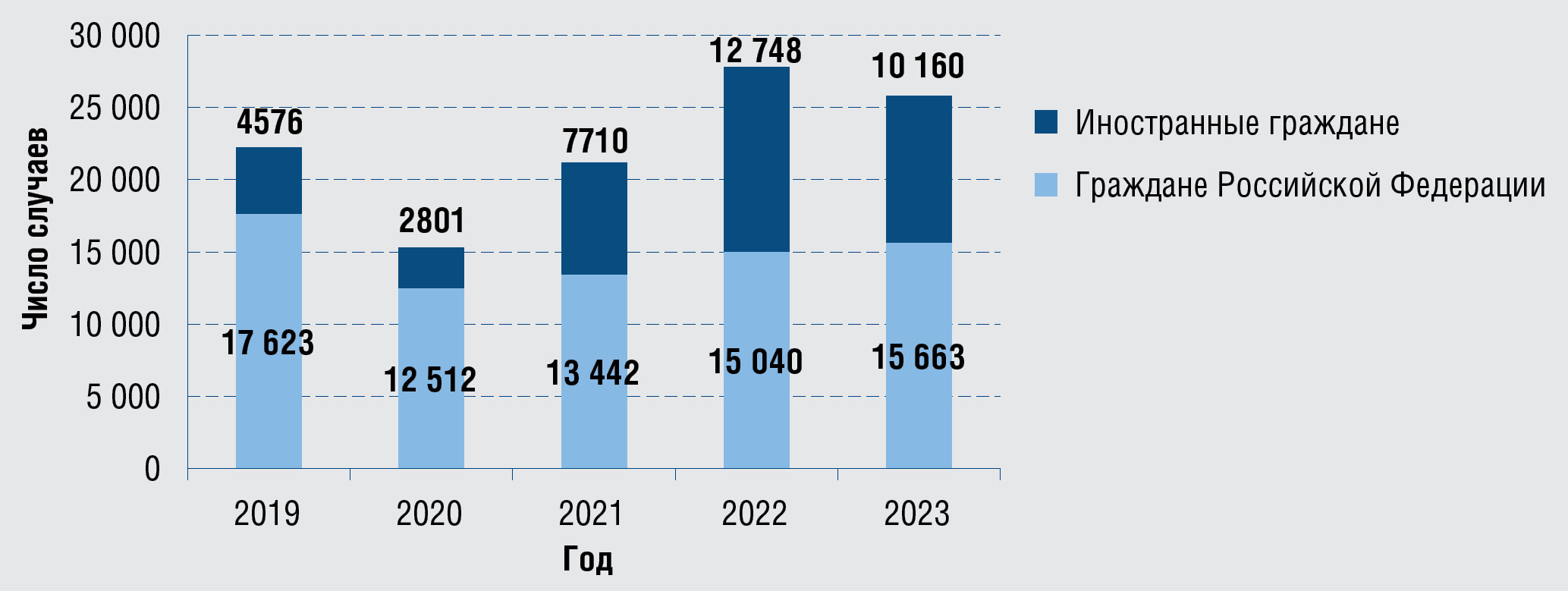 Рис. 16. Число случаев сифилиса с вновь установленным диагнозом, зарегистрированных среди граждан Российской Федерации и иностранных граждан, 2019–2023 гг.