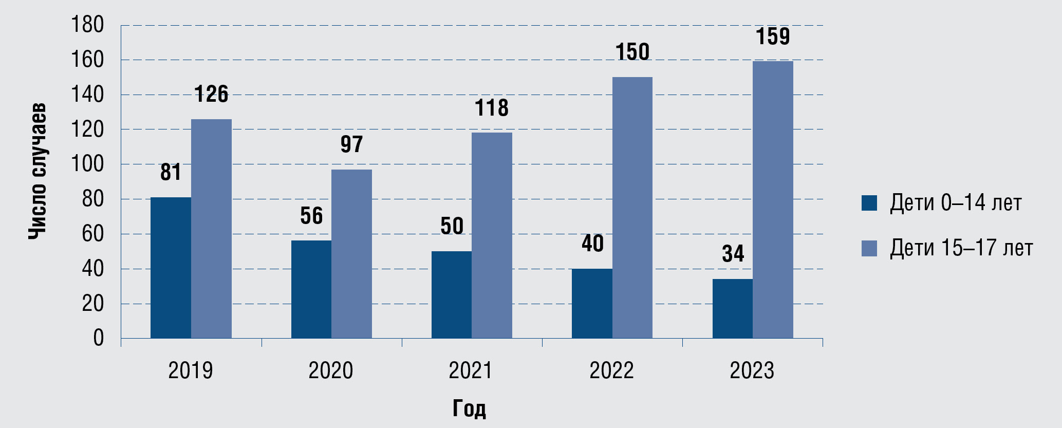 Рис. 18. Число случаев сифилиса с вновь установленным диагнозом, зарегистрированных среди детей 0–14 и 15–17 лет, Российская Федерация, 2019–2023 гг.
