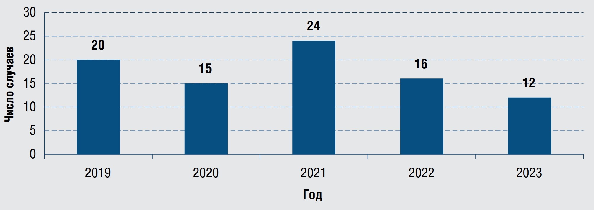 В 2023 г. в РФ число случаев врожденного сифилиса сократилось до 12, что является наименьшим числом на протяжении рассматриваемого периода (рис. 19) [1–4].