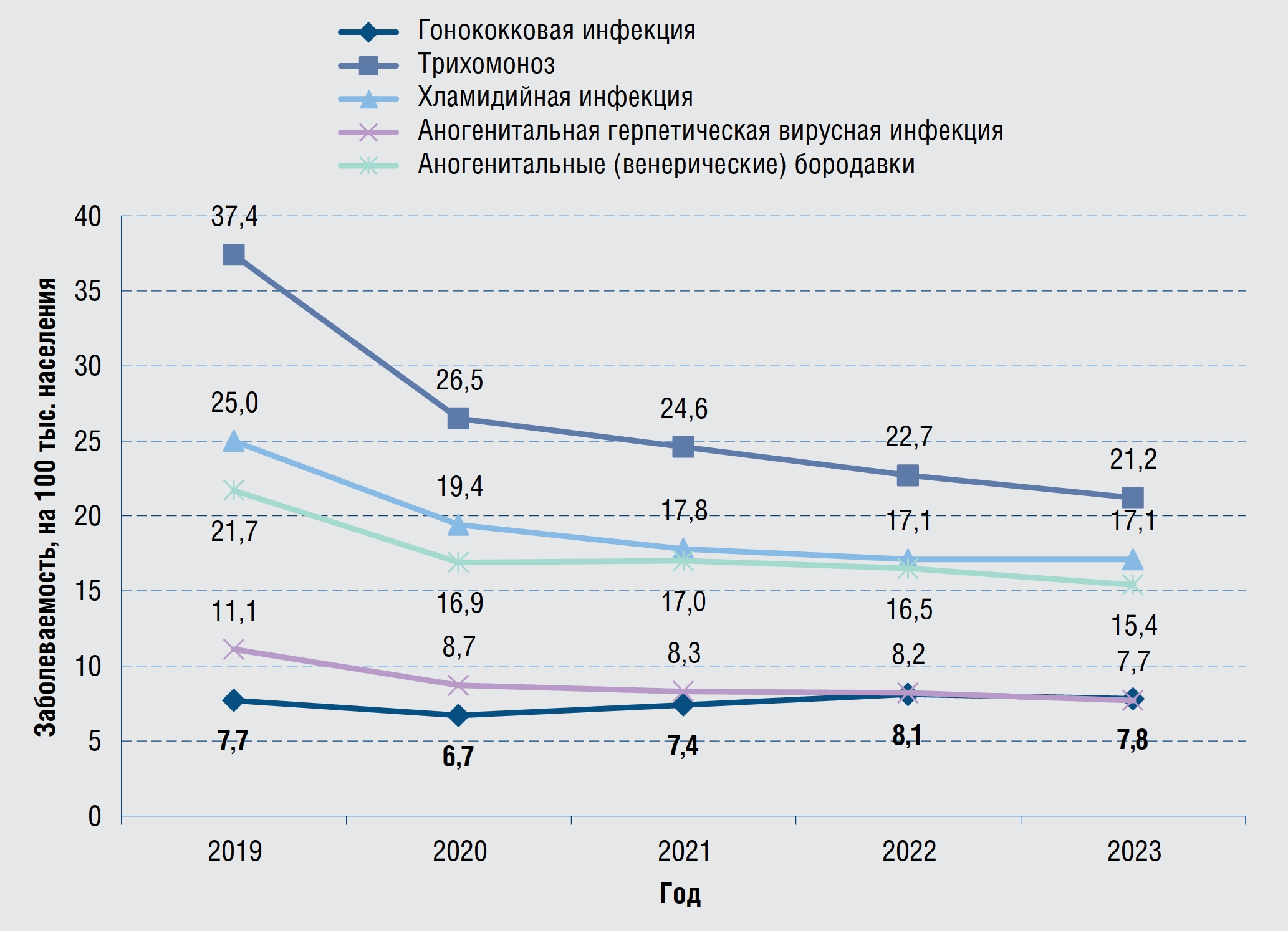 Заболеваемость инфекциями, передаваемыми половым путем, в Российской Федерации в 2019–2023 гг.
