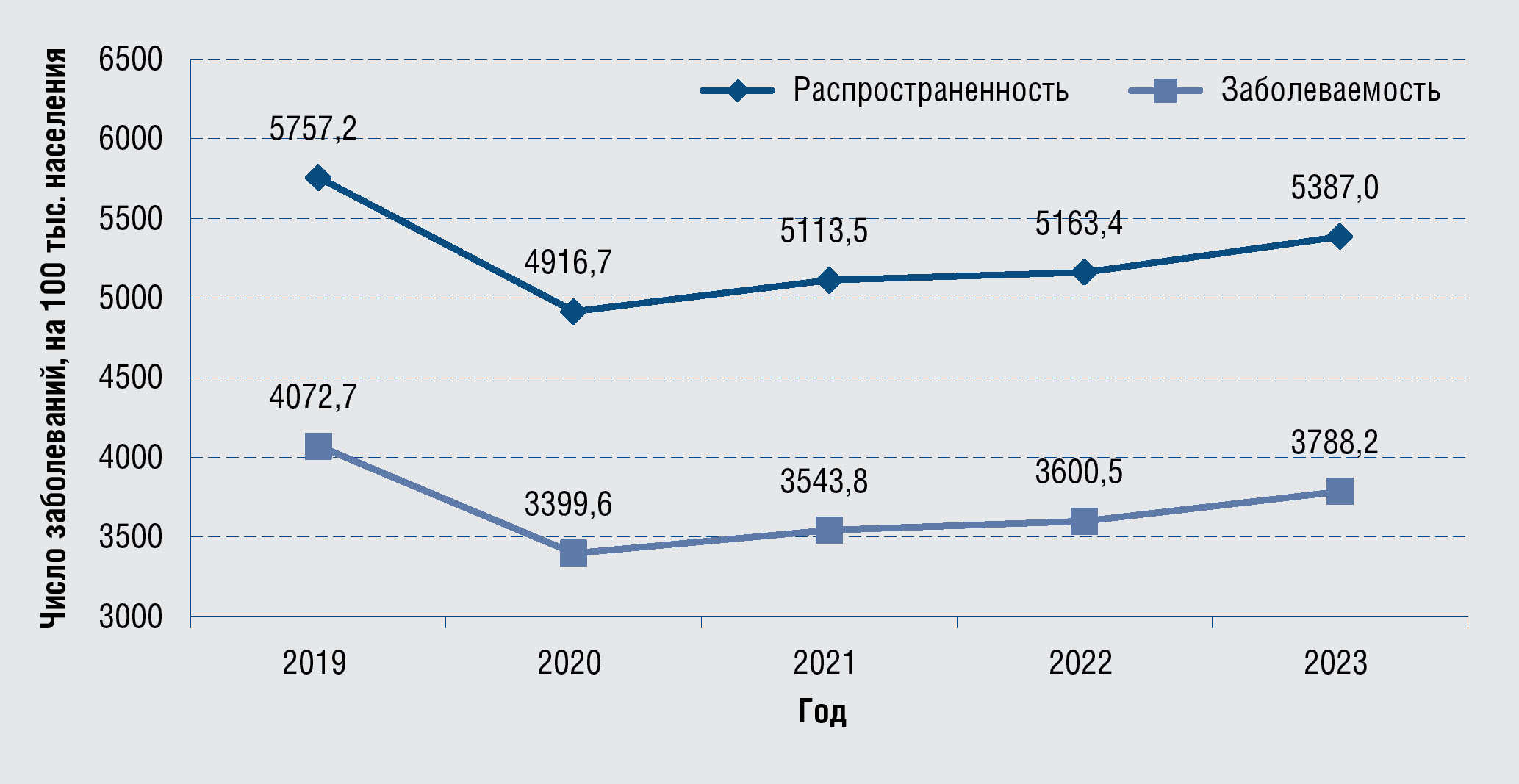Распространенность болезней кожи и подкожной клетчатки среди населения Российской Федерации в 2019–2023 гг.