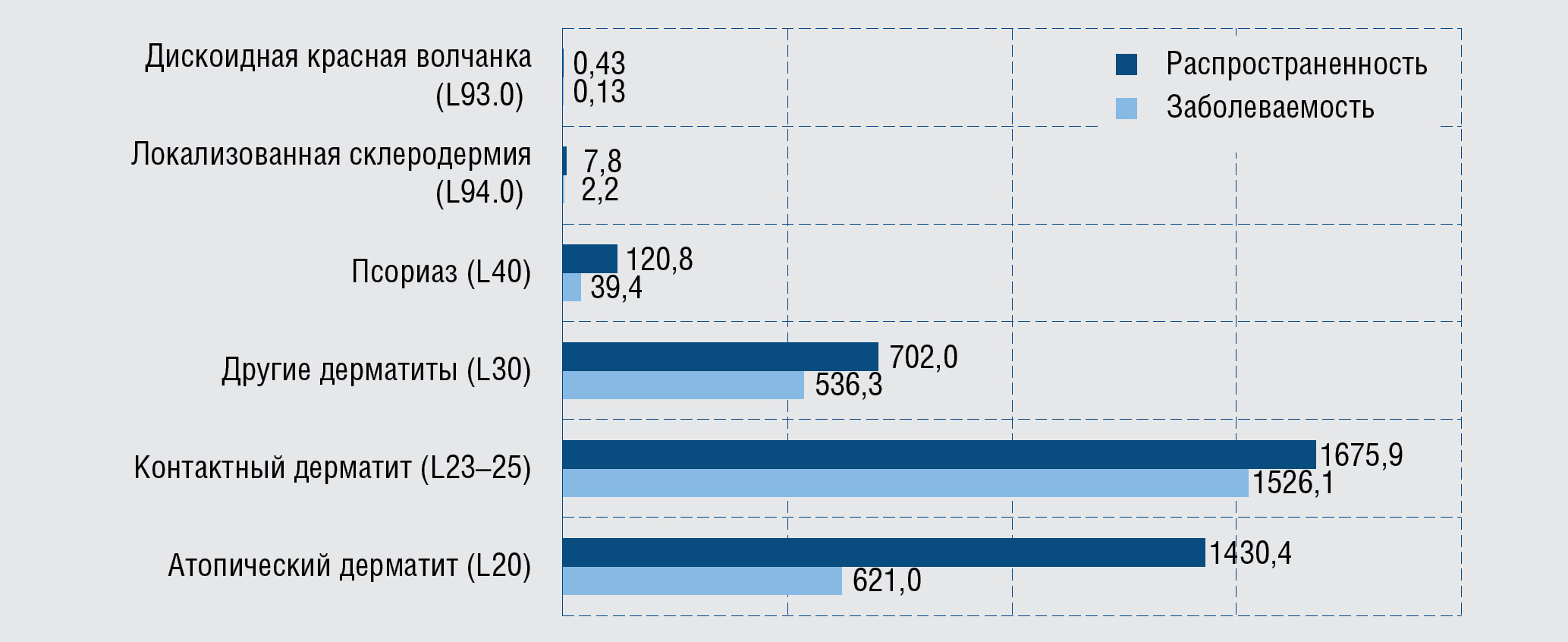 Показатели распространенности и заболеваемости болезнями кожи и подкожной клетчатки взрослого населения РФ в целом по классу приблизительно в 2 раза ниже таковых среди детского населения: в 2023 г. распространенность болезней кожи и подкожной клетчатки среди взрослого населения зарегистрирована на уровне 4613, 6 на 100 тыс. соответствующего населения; заболеваемость — 3202, 9.