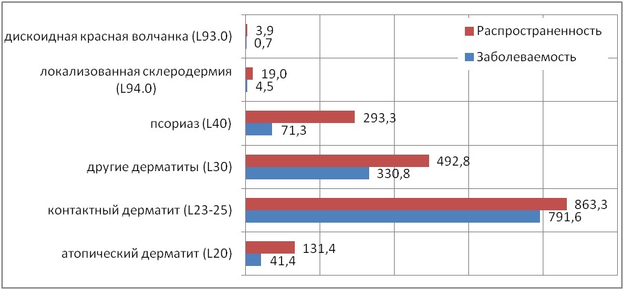 Показатели распространенности и заболеваемости взрослого населения отдельными болезнями класса представлены на рис. 23. Самую высокую распространенность и заболеваемость среди взрослого населения, как и среди детского, имеет контактный дерматит (распространенность — 863, 3 на 100 тыс. взрослого населения; заболеваемость — 791, 6). Также среди взрослого населения распространены другие дерматиты (L30) (распространенность — 492, 8 на 100 тыс. взрослого населения; заболеваемость — 330, 8), тогда как показатели распространенности и заболеваемости атопическим дерматитом (соответственно 131, 4 и 41, 4 на 100 тыс. взрослого населения) существенно ниже, чем среди детского населения (см. рис. 23).