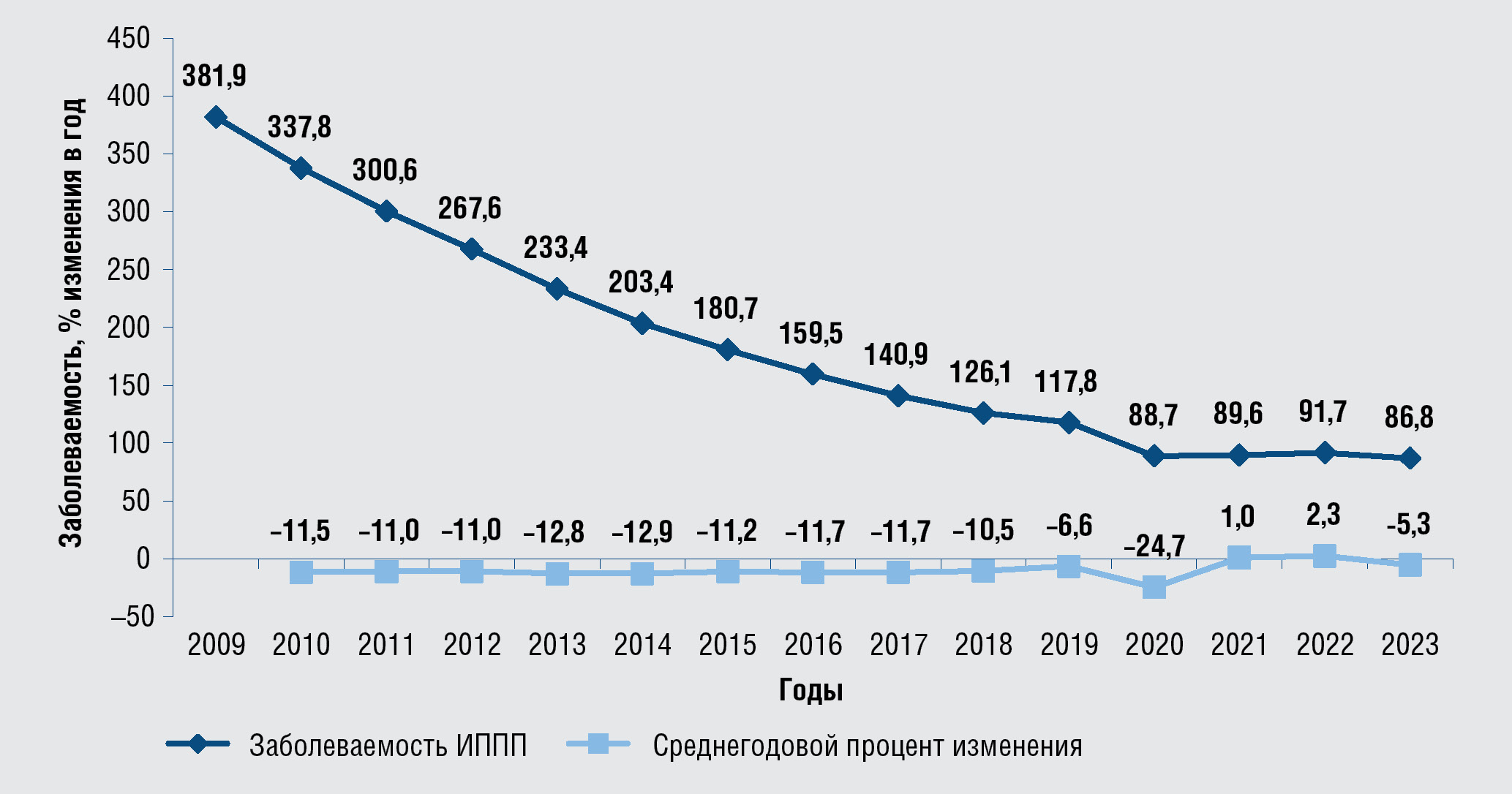Рис. 1. Динамические изменения показателей заболеваемости ИППП в Российской Федерации,2009–2023 гг., на 100 тыс. населения