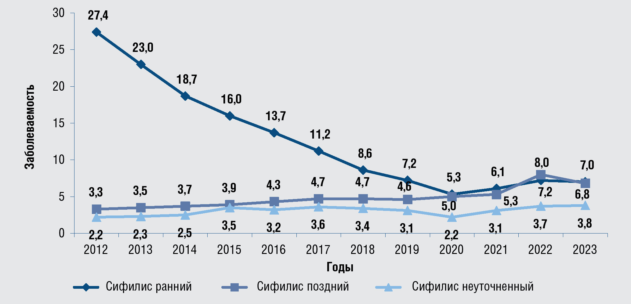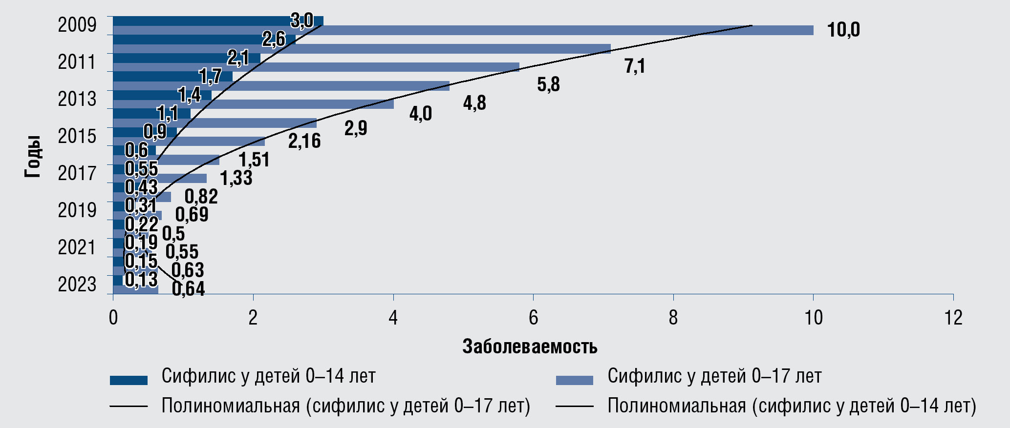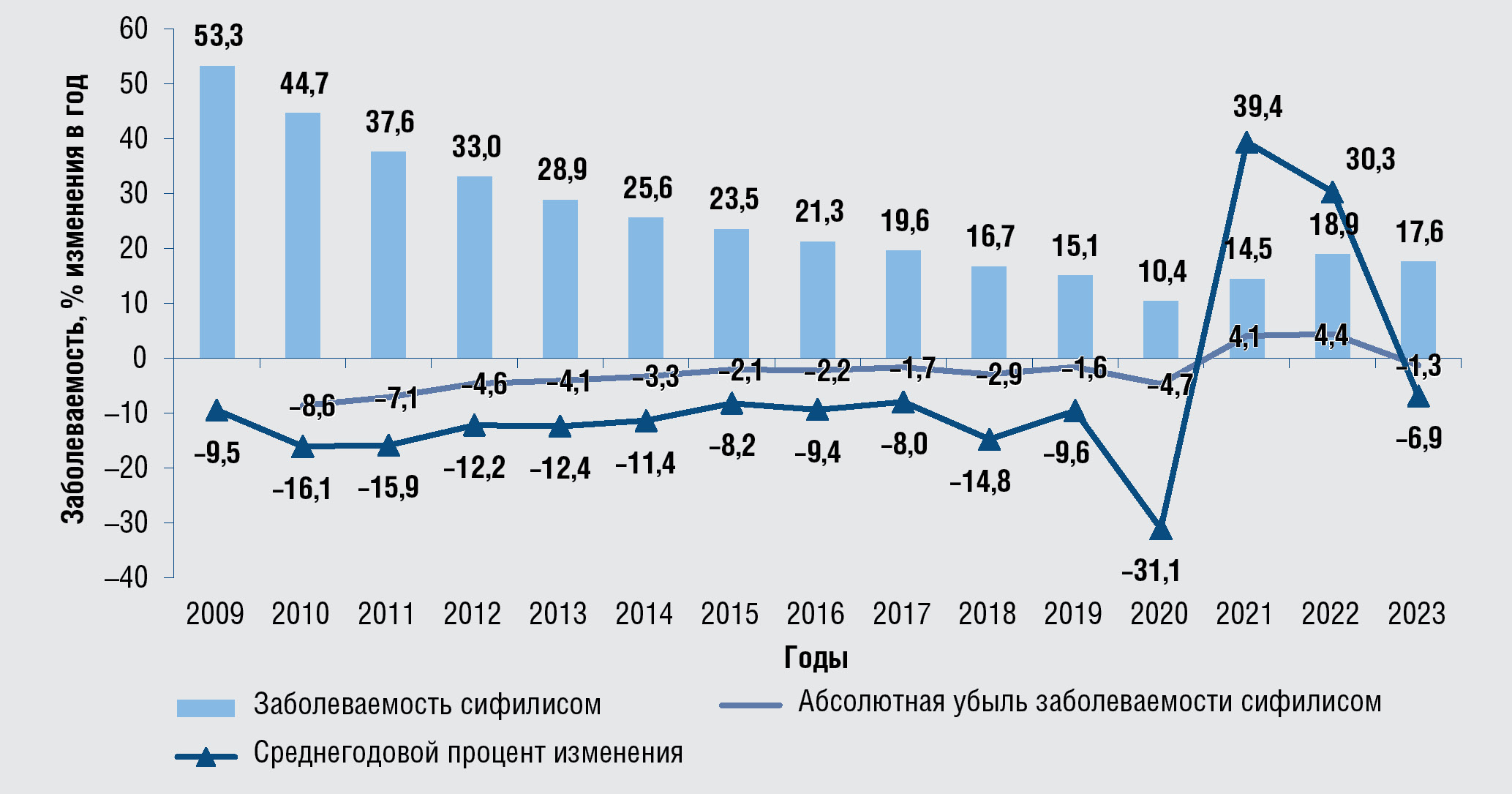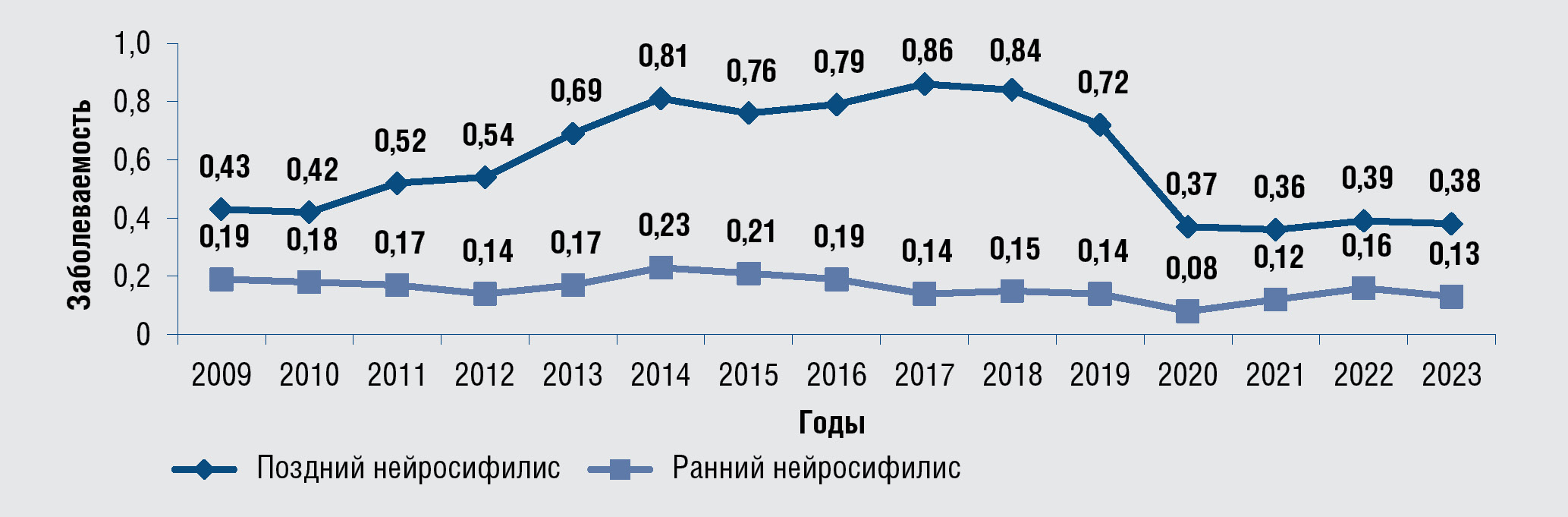 Рис. 2. Динамические изменения показателей заболеваемости сифилисом,2009–2023 гг., на 100 тыс. населения