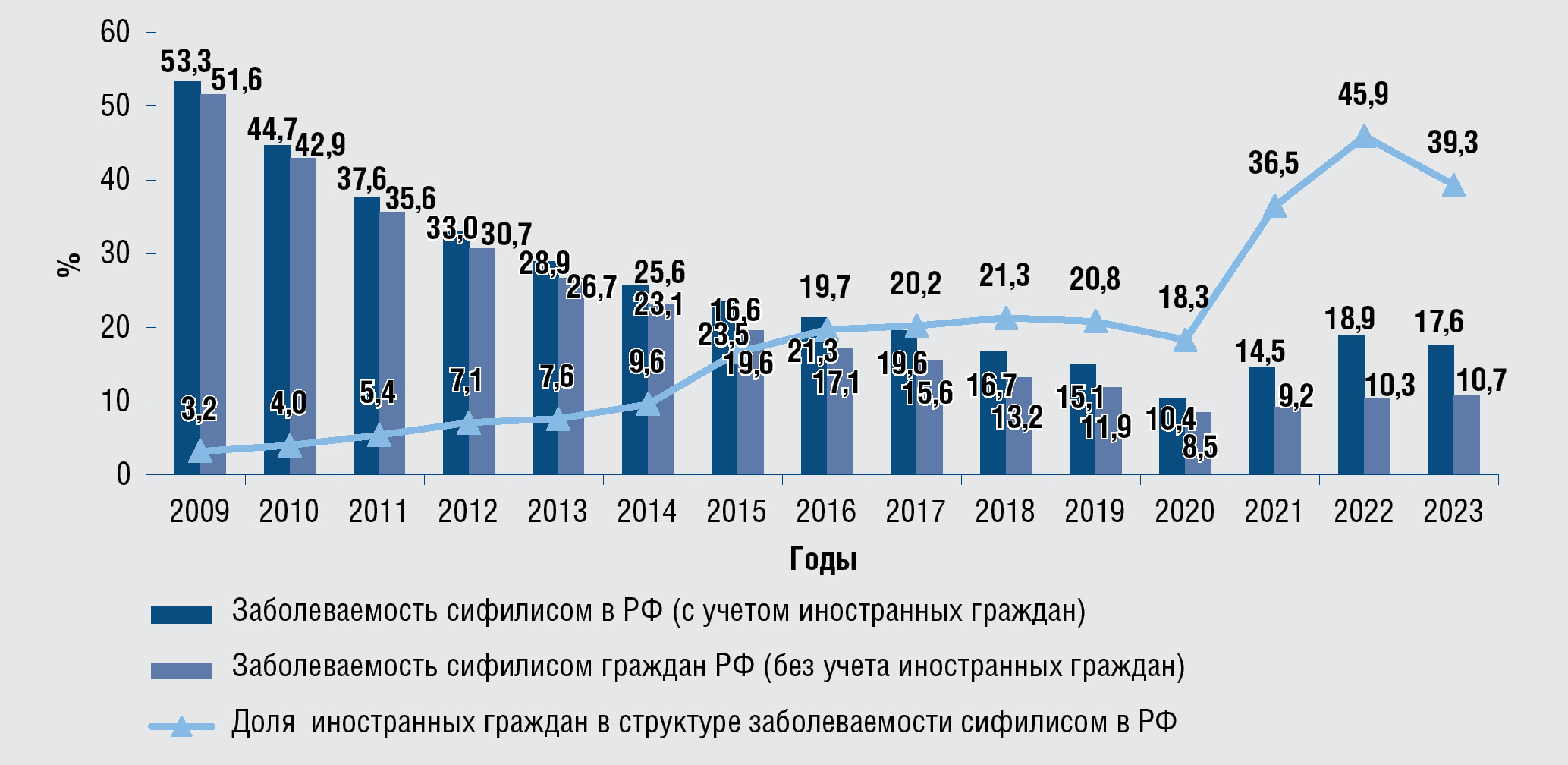 Рис. 4. Динамика заболеваемости сифилисом в целом по России, граждан Российской Федерации и доля иностранных граждан больных сифилисом,2009–2023 гг., на 100 тыс. населения, %