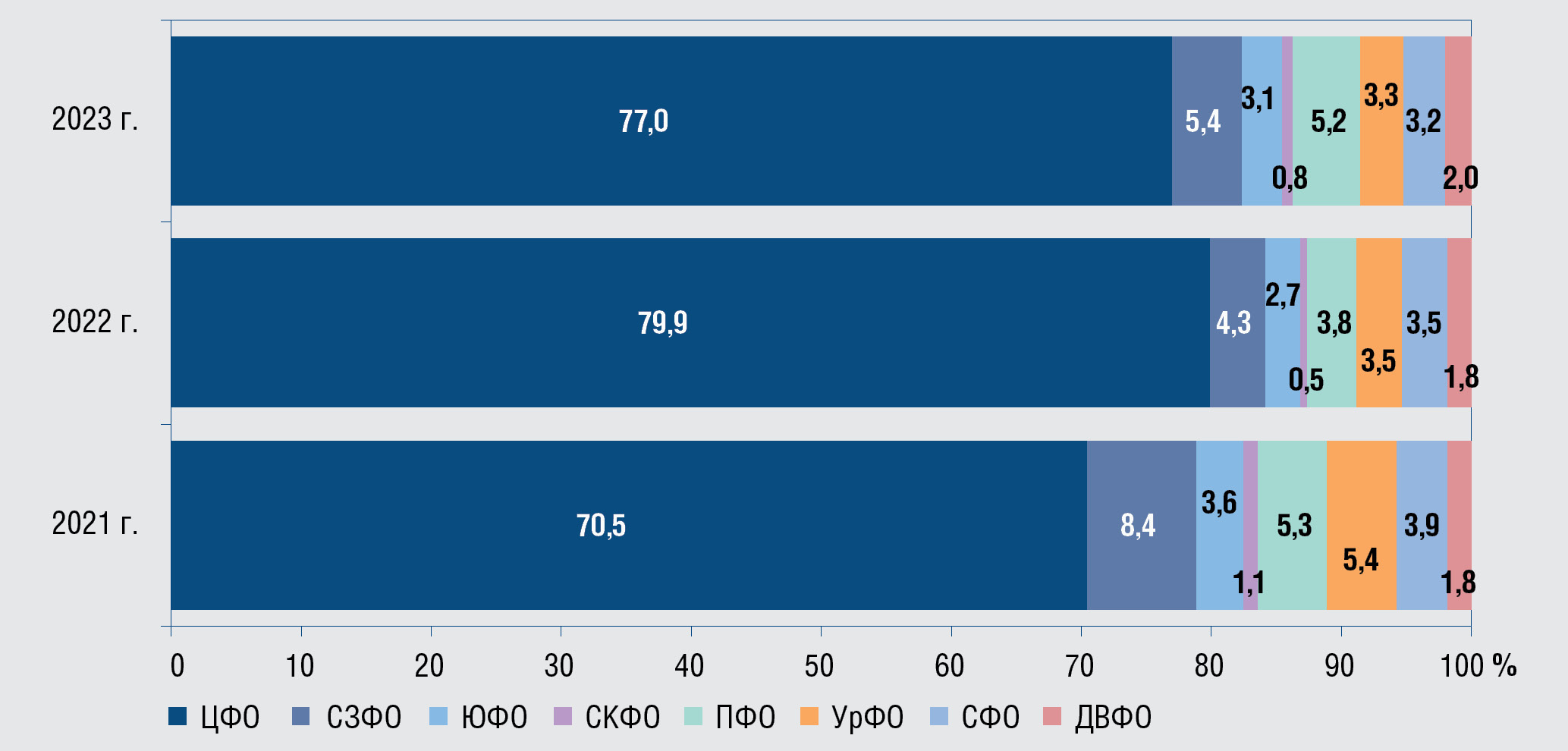 Fig. 5. Share of detected syphilis patients among migrants by federal districts, 2021–2023, %