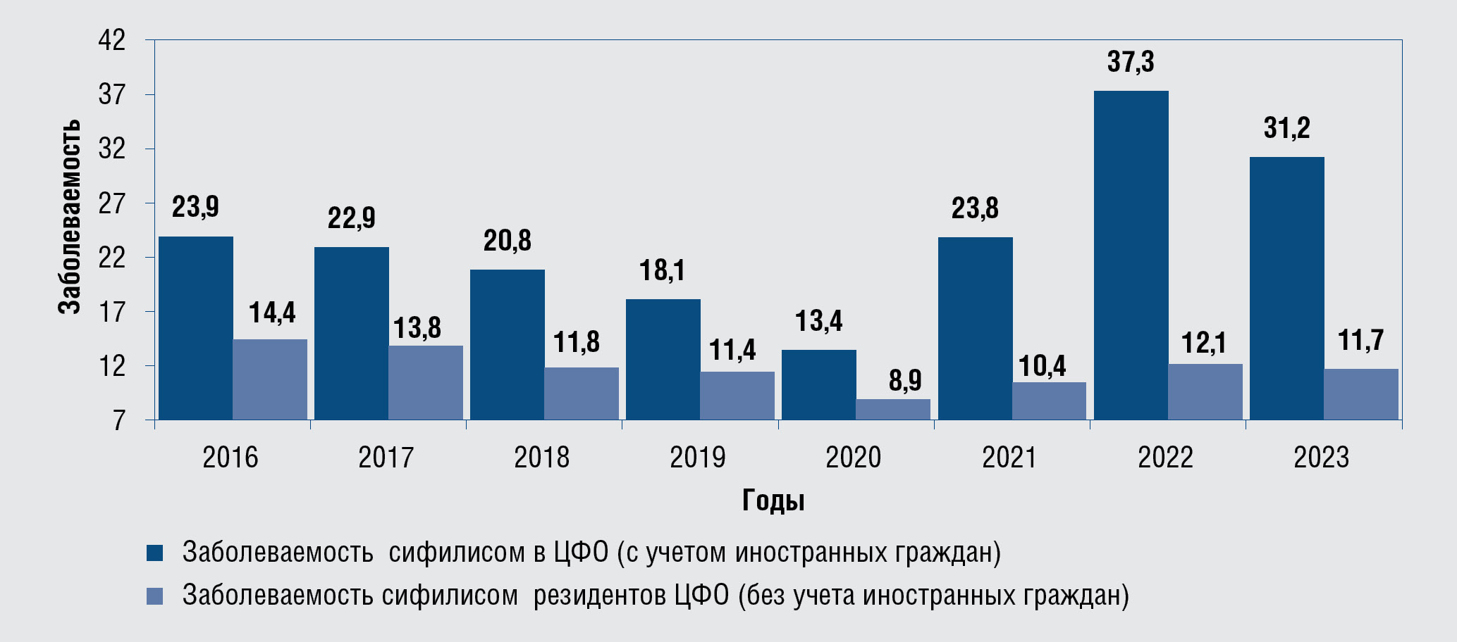 Рис. 6. Заболеваемость сифилисом в Центральном федеральном округе,2016–2023 гг., на 100 тыс. соответствующего населения