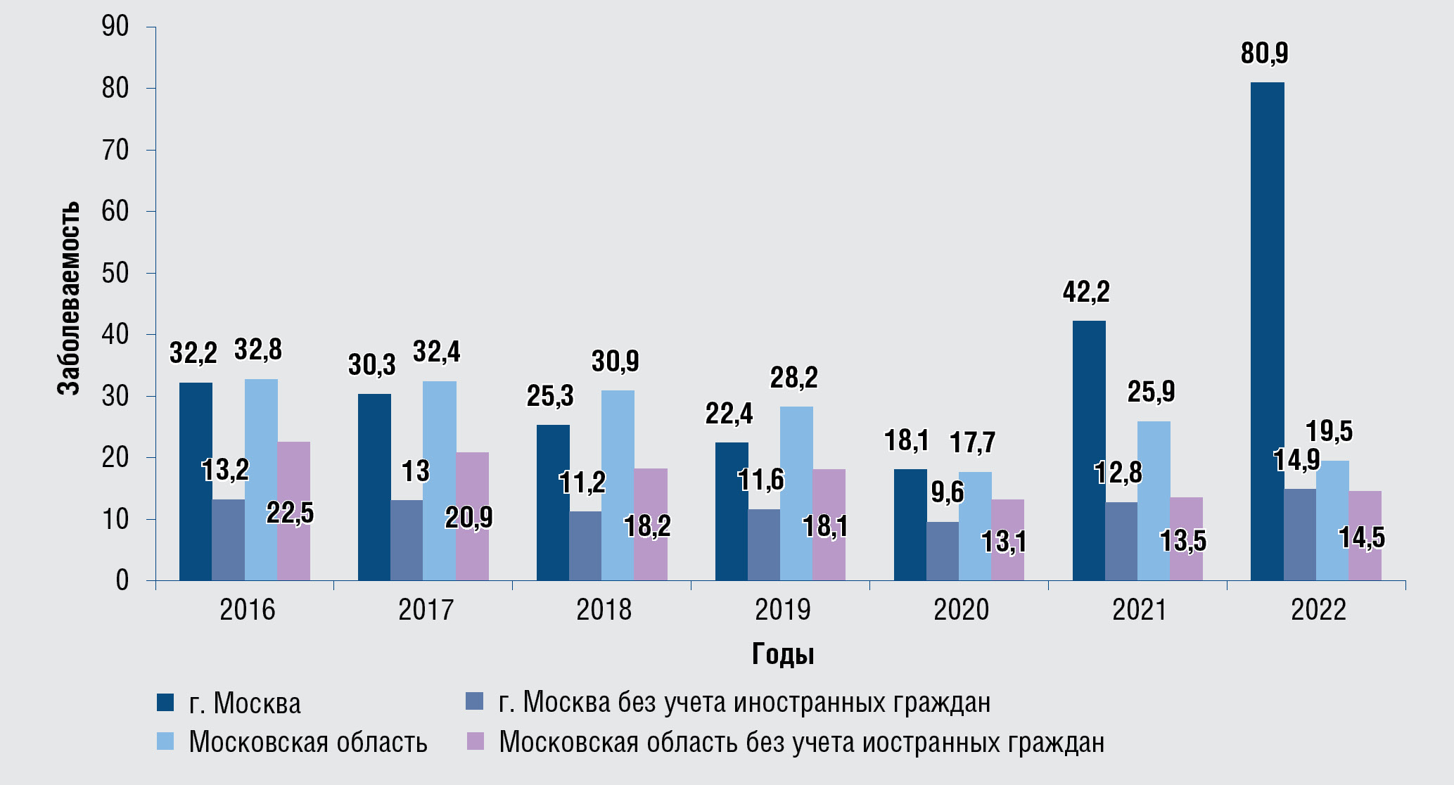 Fig. 7. The incidence of syphilis in Moscow and the Moscow region in general, excluding foreign citizens,2016–2022, per 100 000 of the corresponding population