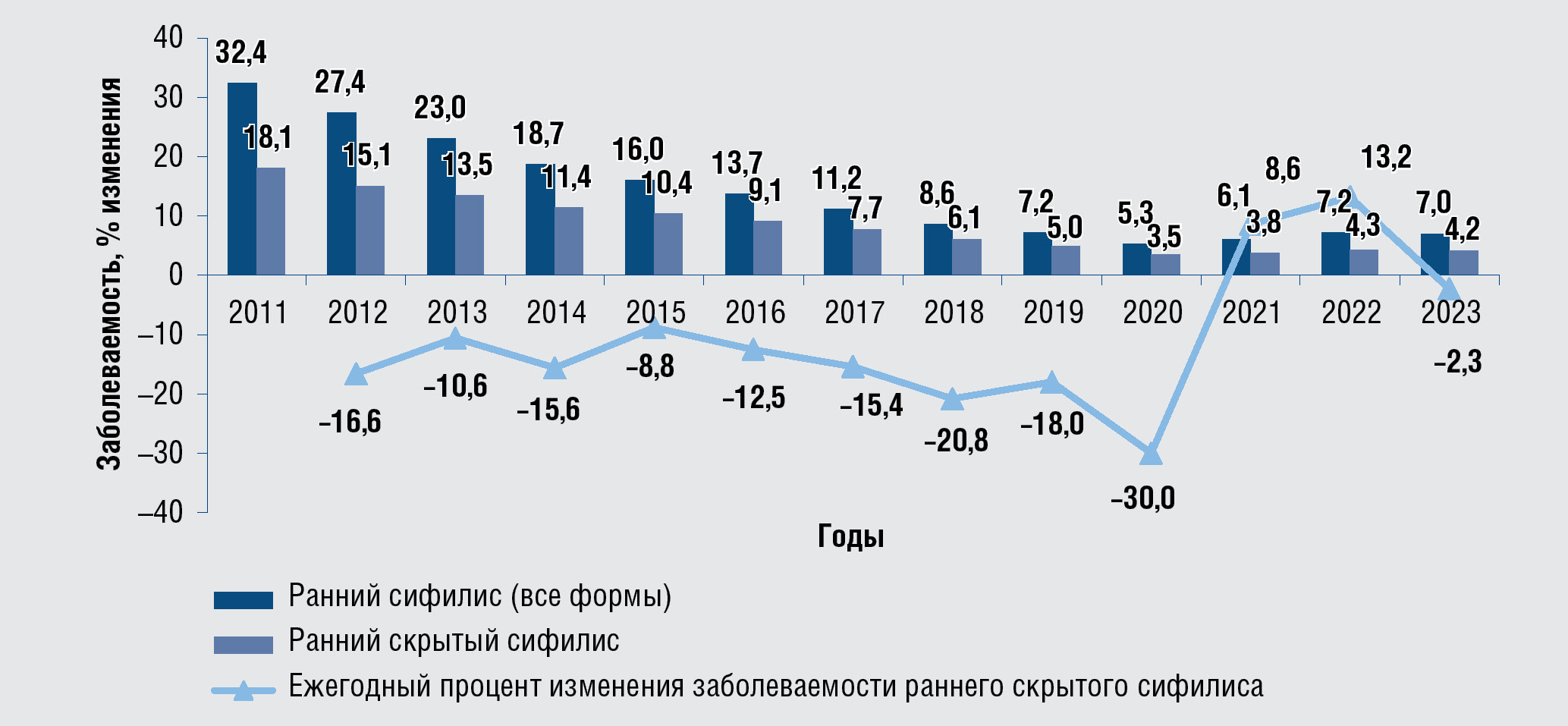 Рис. 9. Динамика заболеваемости сифилисом ранним и ранним скрытым в Российской Федерации,2011–2023 гг., на 100 тыс. населения, % изменения