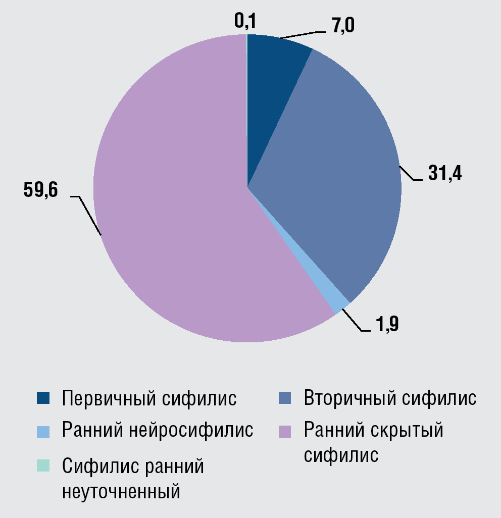 Доля всех форм сифилиса, % | 100 | 78 | 9,4 | 26,5 | 42,1 | 12,9 | 9,1 |