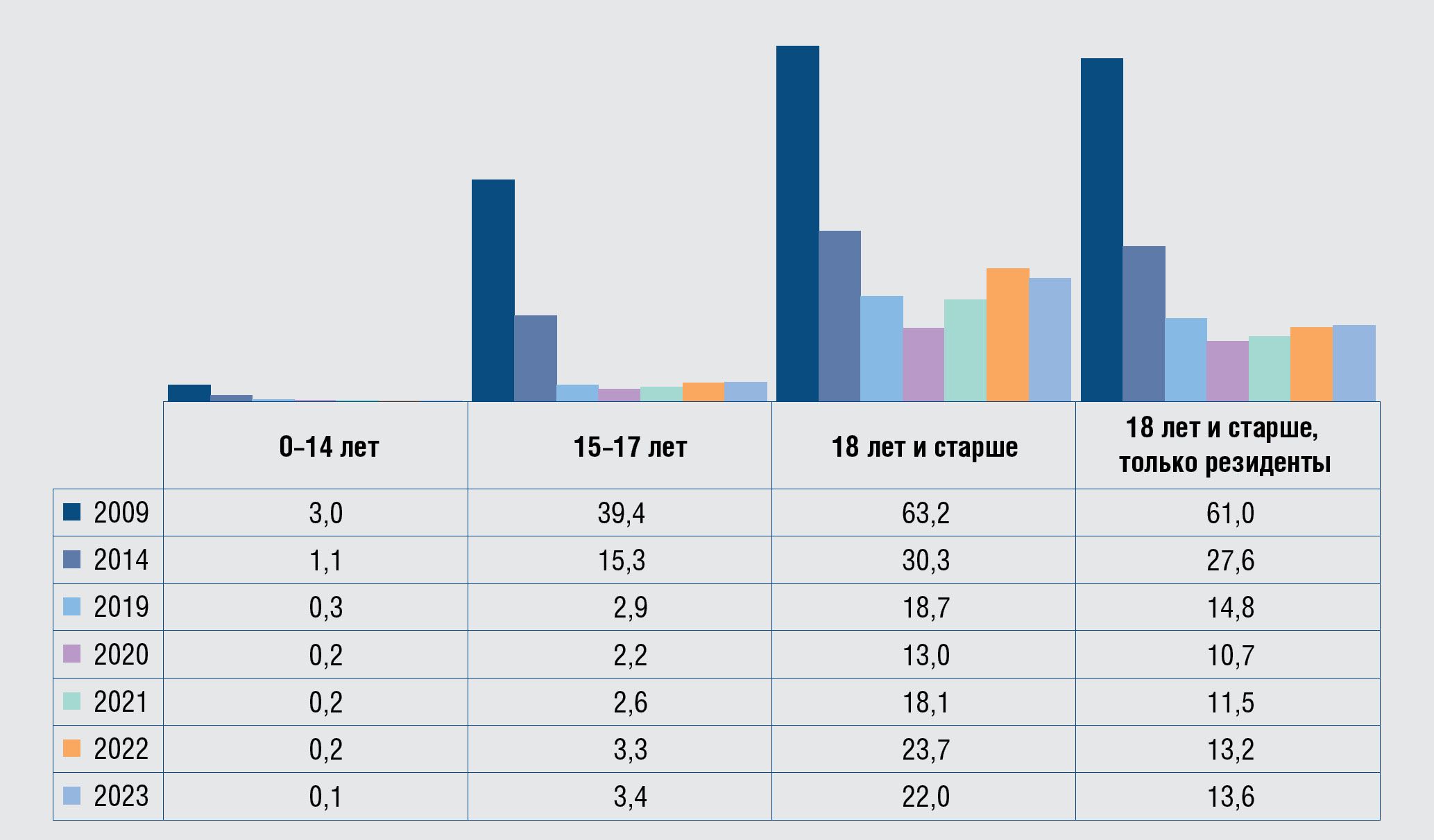 Анализ заболеваемости сифилисом в общей популяции взрослого населения, в совокупности с резидентами и нерезидентами Российской Федерации, показал, что среди резидентов заболеваемость снижалась более интенсивно, чем в общей группе населения. В 2023 г. заболеваемость сифилисом среди резидентов страны сократилась в 4,5 раза по сравнению с 2009 г. и достигла показателя 13,6 случая на 100 тыс. соответствующего населения. В общей группе популяции взрослых лиц за тот же период она снизилась только в 2,8 раза, составив 22,0 случая на 100 тыс. населения данного возраста, что на 25,0% выше среднероссийского показателя заболеваемости сифилисом по всем возрастным категориям. Разрыв в показателях составил 8,4 случая на 100 тыс. соответствующего населения, который и приходился на нерезидентов страны.