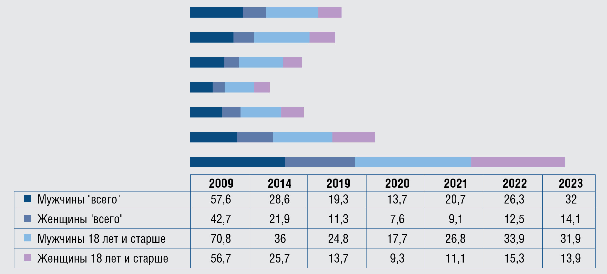 Рис. 14. Заболеваемость сифилисом мужчин и женщин среди всего населения и среди взрослой популяции старше 18 лет в Российской Федерации,2009,2014 и 2019–2023 гг., на 100 тыс. соответствующего населения
