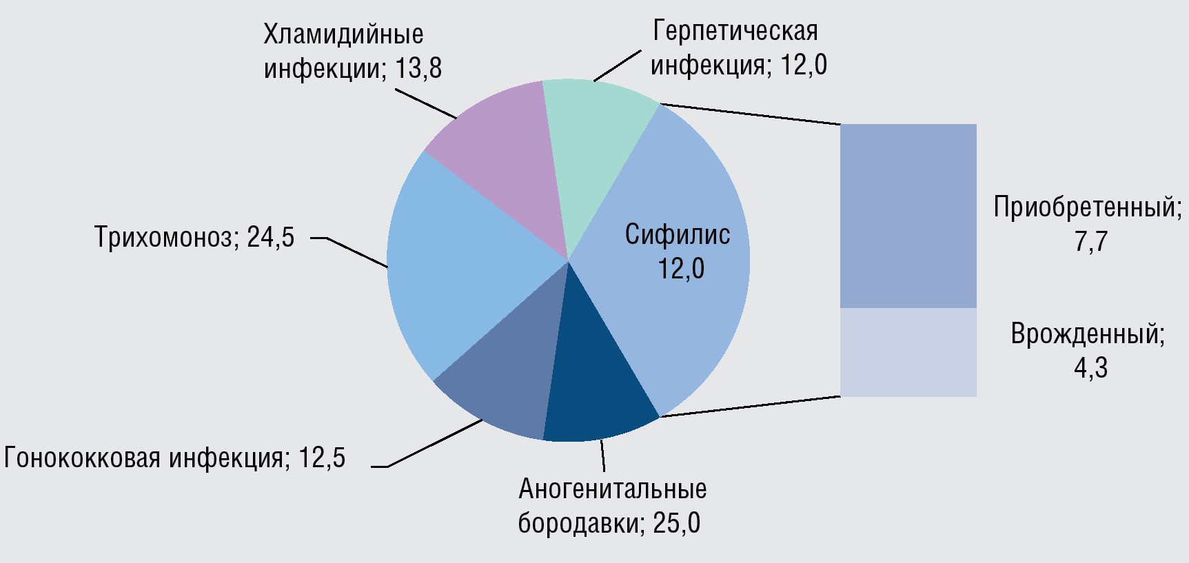 В 2023 г. в Российской Федерации было зарегистрировано 127 080 новых случаев ИППП, что соответствует 86,8 случая на 100 тыс. населения. Темп снижения составил 5,1% по отношению к аналогичному показателю предыдущего года (91,7 случая на 100 тыс. населения) и 77,3% — к показателю 2009 г. (381,9 случая на 100 тыс. населения). В структуре нозологий интенсивность снижения была неравнозначной. Наибольший процент снижения наблюдался среди бактериальных инфекций, наименее интенсивно снижалась заболеваемость вирусными ИППП. В 2023 г. по отношению к 2009 г. заболеваемость трихомонозом снизилась на 85,3% (с 144,7 до 21,2 случая); гонококковой инфекцией — на 83,8% (с 48,1 до 7,8 случая); хламидийными инфекциями — на 78,7% (80,3 до 17,1 случая); сифилисом — на 67,0% (с 53,3 до 17,6 случая); аногенитальной герпетической вирусной инфекцией — на 63,0% (с 20,8 до 7,7 случая); аногенитальными (венерическими) бородавками — на 55,6% (34,7 до 15,4 случая). Уровень заболеваемости среди инфекций варьировал в пределах от 21,2 до 7,7 случая на 100 тыс. населения.