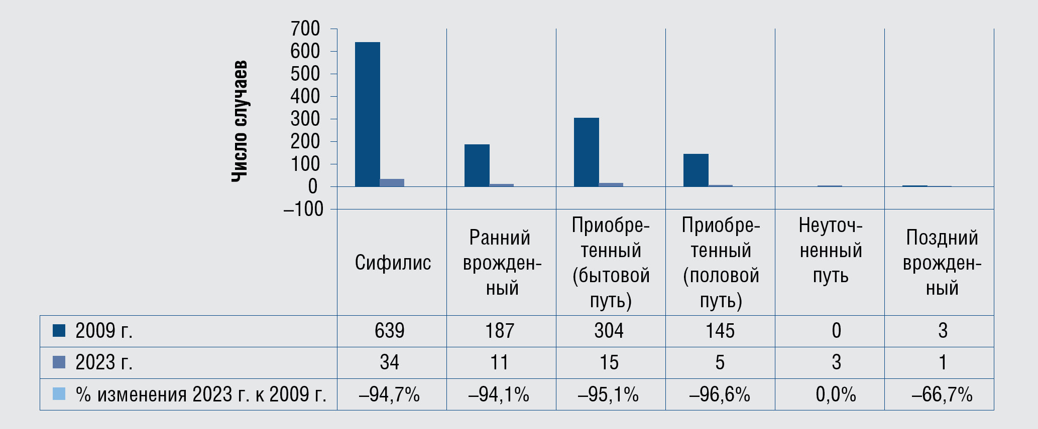 Следует также отметить, что продолжается регистрация позднего врожденного сифилиса (2009 г. — 3 случая,2023 г. — 1 случай) и случаев приобретенного сифилиса в группе детей в возрасте до 0–1 года (2023 г. — 2 случая), что не исключает своевременно недиагностированных случаев врожденного сифилиса.