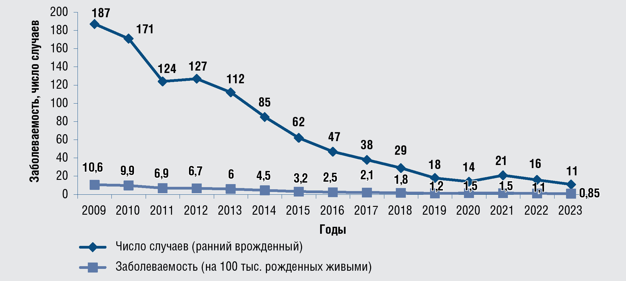 Рис. 18. Заболеваемость врожденным сифилисом на 100 живорожденных детей и число зарегистрированных случаев раннего врожденного сифилиса