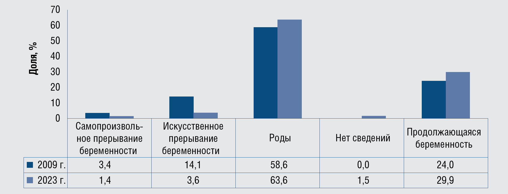 Рис. 19. Исходы беременности среди женщин с вновь установленным диагнозом сифилиса в 2009 и 2023 гг., %