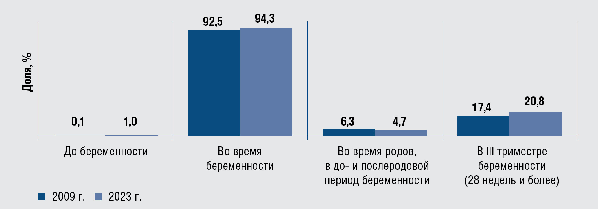 Fig. 20. Timing of syphilis diagnosis among first-time pregnant women, 2009 and 2023, %