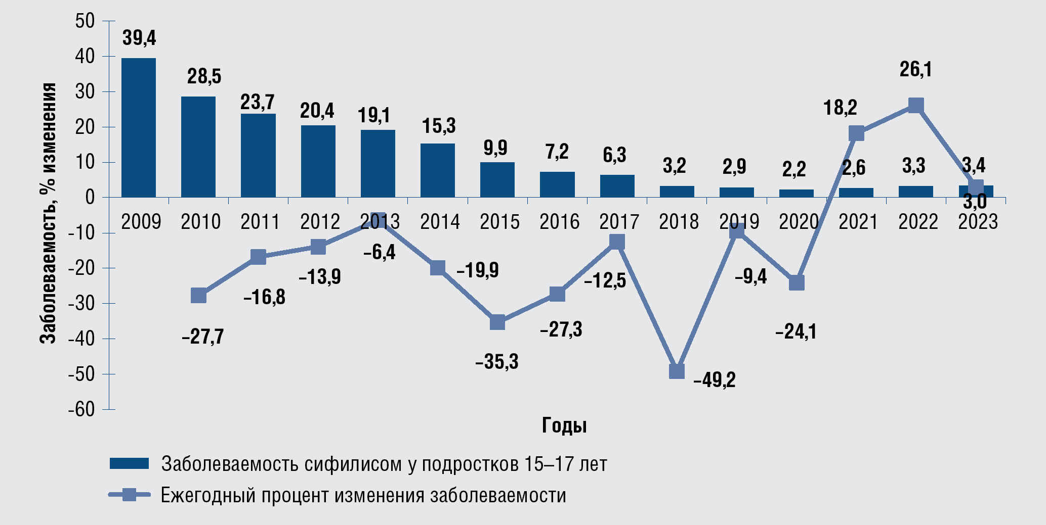 Рис. 21. Динамические изменения заболеваемости сифилисом в популяции 15–17 лет,2009–2023 гг., на 100 тыс. соответствующего населения, интенсивность изменения, %