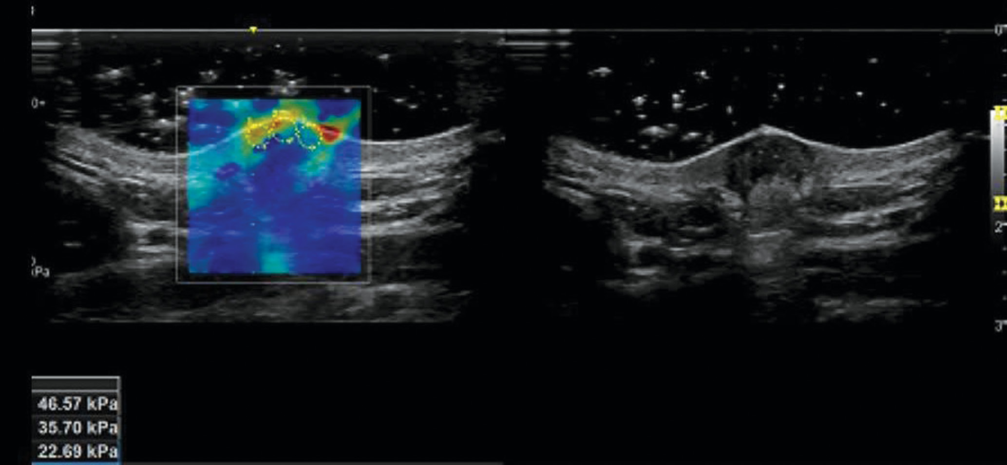 Рис. 3. Эластография гипетрофического рубца кожи голени у женщины 19 лет: слева —эластограмма; справа — этот же рубец в В-режиме