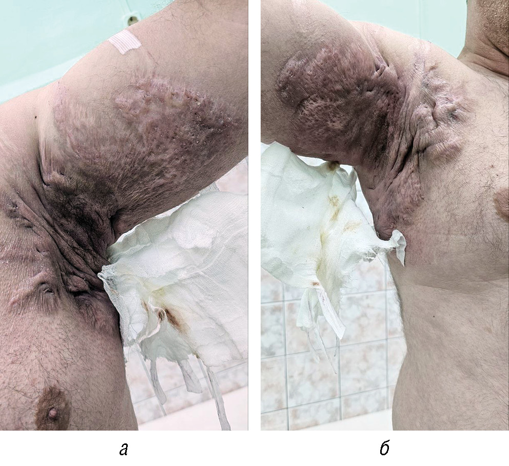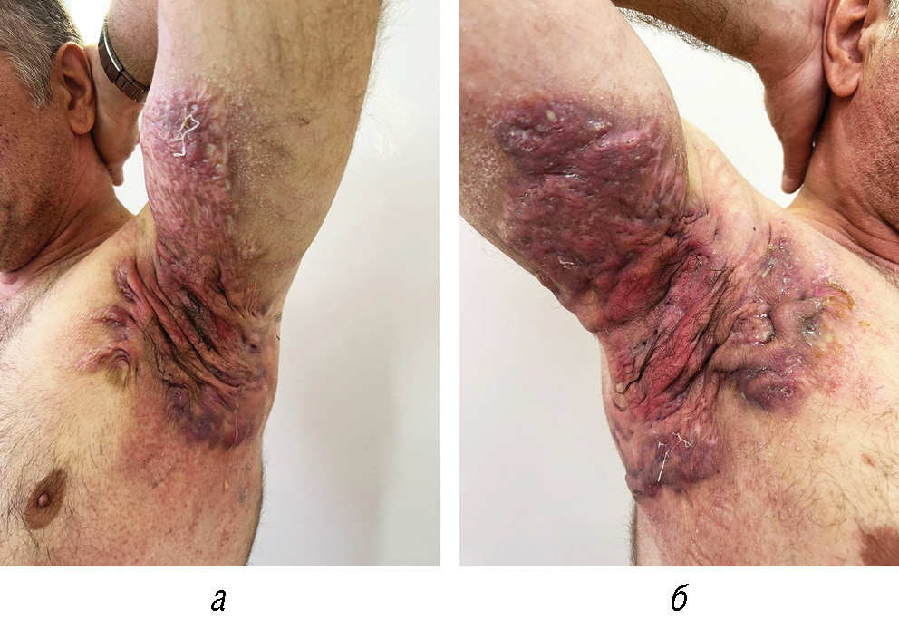Со слов пациента, болеет более 15 лет, когда впервые появились болезненные узловатые образования в правой подмышечной области. Свое заболевание ни с чем не связывает. Неоднократно получал лечение у хирурга по месту жительства по поводу гидраденита, где ему проводились множественные резекции воспалительных элементов и дренирование очагов. После чего назначались короткие курсы различных антибактериальных препаратов. Эффекта от лечения пациент не отмечал. Через 2–3 года подобные высыпания появились в левой подмышечной области, а через 6 лет — в области пахово-бедренной складки. С 2018 г. получал лечение у дерматолога: наружная терапия, системные глюкокортикостероиды, различные антибактериальные препараты, изотретиноин — без эффекта.