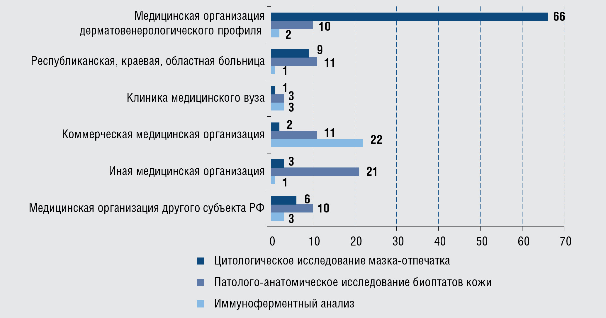 Патологоанатомическое исследование биопсийного материала кожи с применением иммунофлюоресцентных методов (реакции иммунофлюоресценции) выполнялось в 16 (24,2%) субъектах РФ. Вместе с тем установлено, что медицинские организации дерматовенерологического профиля, предоставившие информацию, исследования этим методом самостоятельно на базе своих лабораторий не проводили. Для проведения исследований биоптатов кожи с применением иммунофлюоресцентных методов 6 медицинских организаций дерматовенерологического профиля направляли биоптаты кожи в республиканскую, краевую или областную больницу; 1 медицинская организация — в клинику медицинского вуза; 4 — в коммерческую медицинскую организацию; 5 — в иную медицинскую организацию; 5 — в медицинскую организацию другого субъекта РФ.
