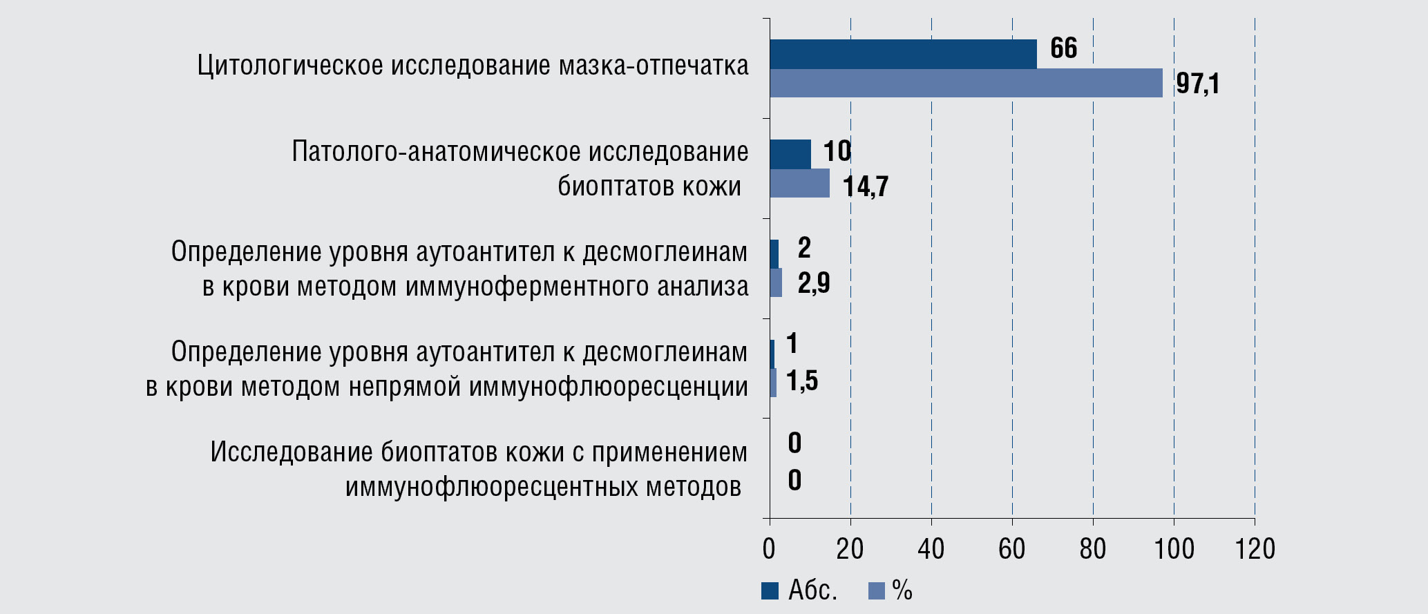 В 46 (67,6%) медицинских организациях дерматовенерологического профиля из 45 (68,2%) субъектов РФ для диагностики пузырчатки использовалось патологоанатомическое исследование биопсийного материала кожи. В 10 (14,7%) медицинских профильных организациях 10 (15,2%) субъектов РФ для диагностики пузырчатки патологоанатомическое исследование биоптатов кожи проводилось на базе собственных лабораторий; в 42 (63,6%) субъектах РФ — на базе других медицинских учреждений. Данный вид исследования в 11 субъектах РФ проводился в республиканской, краевой или областной больнице; в 3 — в клинике медицинского вуза; в 11 — в коммерческой медицинской организации; в 21 — в иной медицинской организации; в 10 — в медицинской организации другого субъекта РФ. При этом в 36 субъектах РФ патологоанатомическое исследование биоптатов кожи выполнялось только на базе других медицинских организаций, а в 20 субъектах РФ — как на своей, так на другой базе. В 22 (32,4%) профильных медицинских организациях 21 (31,8%) субъекта РФ патологоанатомическое исследование биопсийного материала кожи не проводилось.