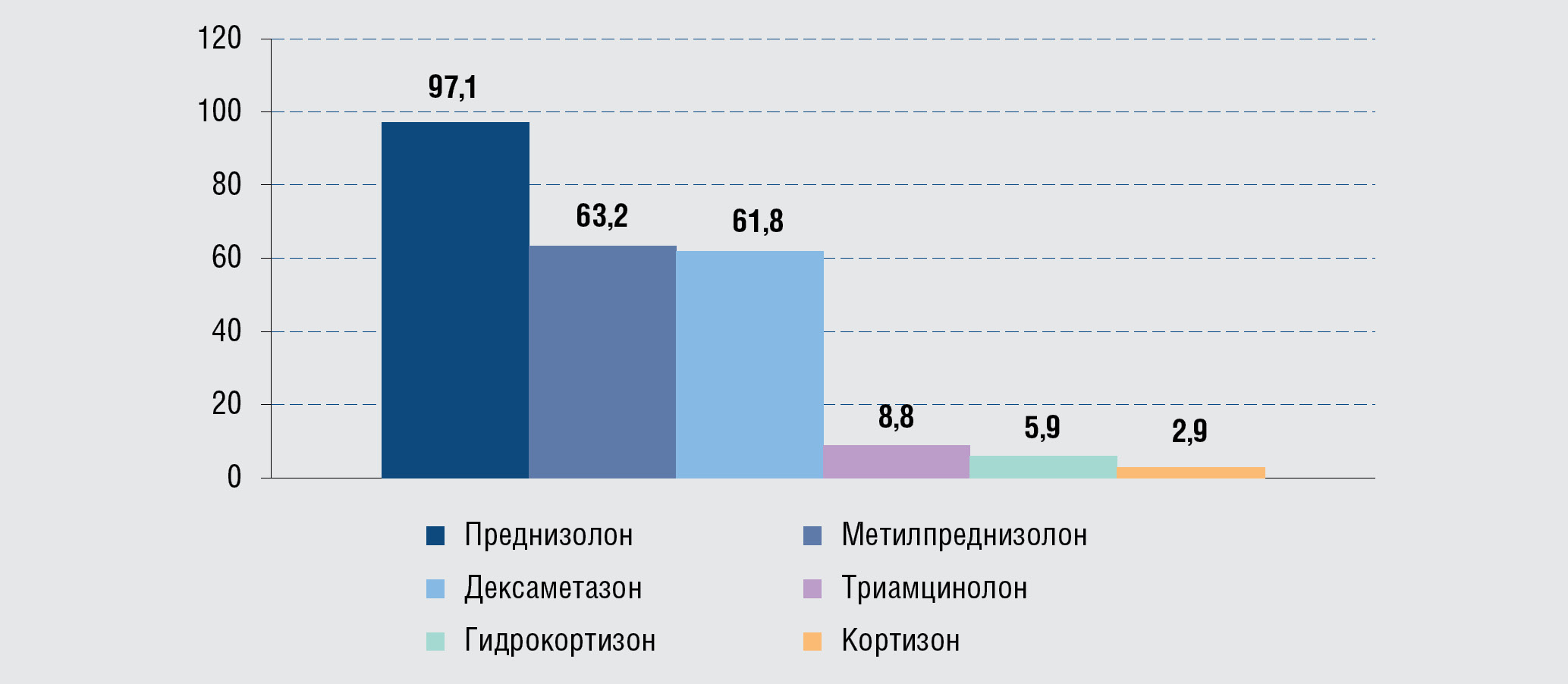 Для лечения пациентов с пузырчаткой кортикостероиды системного действия применяли перорально (гидрокортизон — в 4 (5,9%) медицинских организациях дерматовенерологического профиля; дексаметазон — в 42 (61,8%); кортизон — в 2 (2,9%); метилпреднизолон — в 43 (63,2%); преднизолон — в 66 (97,1%), триамцинолон — в 6 (8,8%)) и парентерально (бетаметазон — в 29 (42,6%) медицинских организациях дерматовенерологического профиля; гидрокортизон — в 1 (1,5%); дексаметазон — в 54 (79,4%); метилпреднизолон — в 4 (4,4%); преднизолон — в 64 (94,1%); триамцинолон — в 2 (2,9%)) (рис. 3).