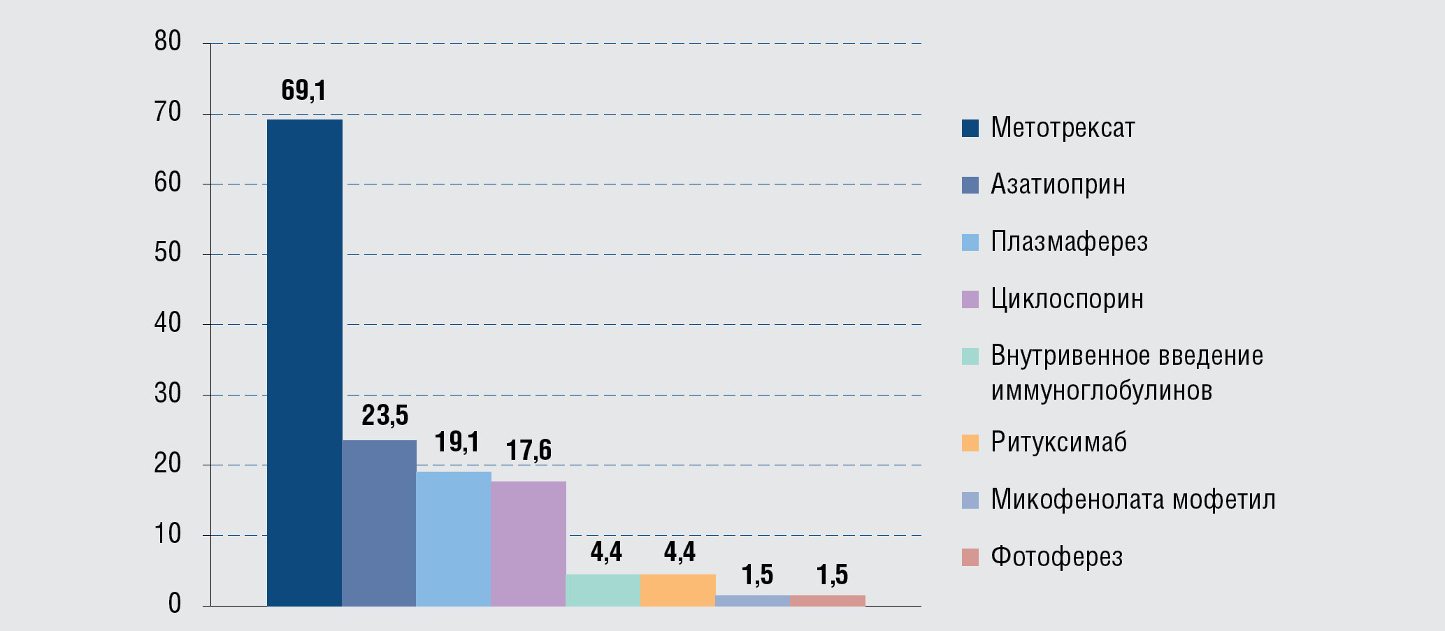 Рис. 5. Частота назначения различных методов терапии больным пузырчаткой по данным из 67 медицинских профильных организаций, %