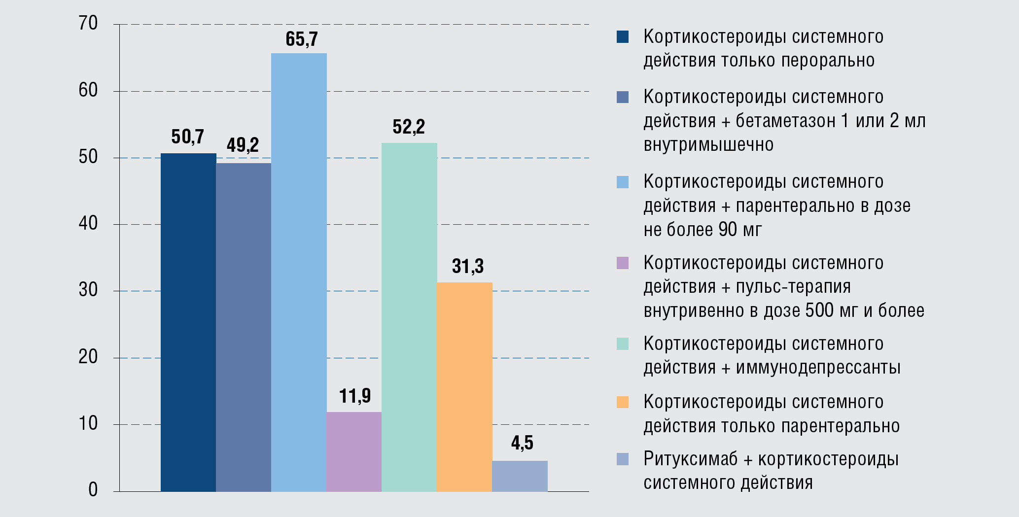 Из 67 профильных медицинских организаций в 34 (50,7%) кортикостероиды системного действия применяли перорально; в 33 (49,2%) — перорально в комбинации с парентеральным введением системных кортикостероидов пролонгированного действия (бетаметазон — 1 или 2 мл внутримышечно); в 44 (65,7%) — перорально в комбинации с парентеральным введением кортикостероидов в дозе не более 90 мг по преднизолоновому эквиваленту (преднизолон — 30, 60 или 90 мг); в 8 (11,9%) — перорально комбинации с пульс-терапией кортикостероидами внутривенно (в дозе от 500 мг и больше по преднизолоновому эквиваленту); в 35 (52,2%) — перорально в комбинации с иммунодепрессантами (метотрексатом, циклоспорином, азатиоприном и др.); в 21 (31,3%) медицинской организации кортикостероиды применялись парентерально (внутримышечно или внутривенно) (рис. 5).