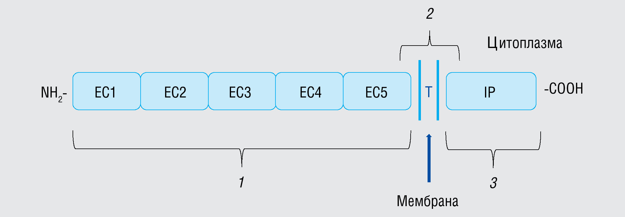 Рис. 1. Доменная организация Dsg3: 1 — внеклеточные домены; 2 — трансмембранный домен; 3 — внутриклеточный домен