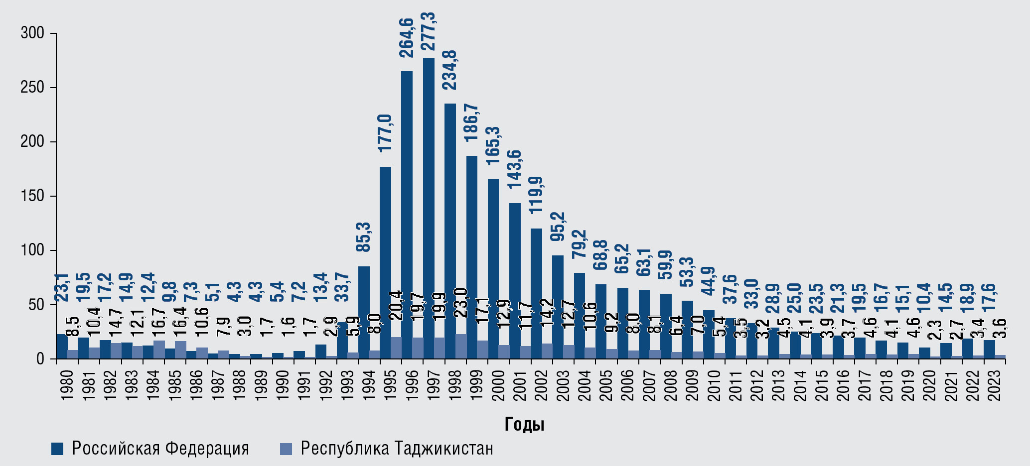 Рис. 1. Заболеваемость сифилисом (все формы) в Российской Федерации и Республике Таджикистан, 1980–2023 гг., на 100 тыс. населения