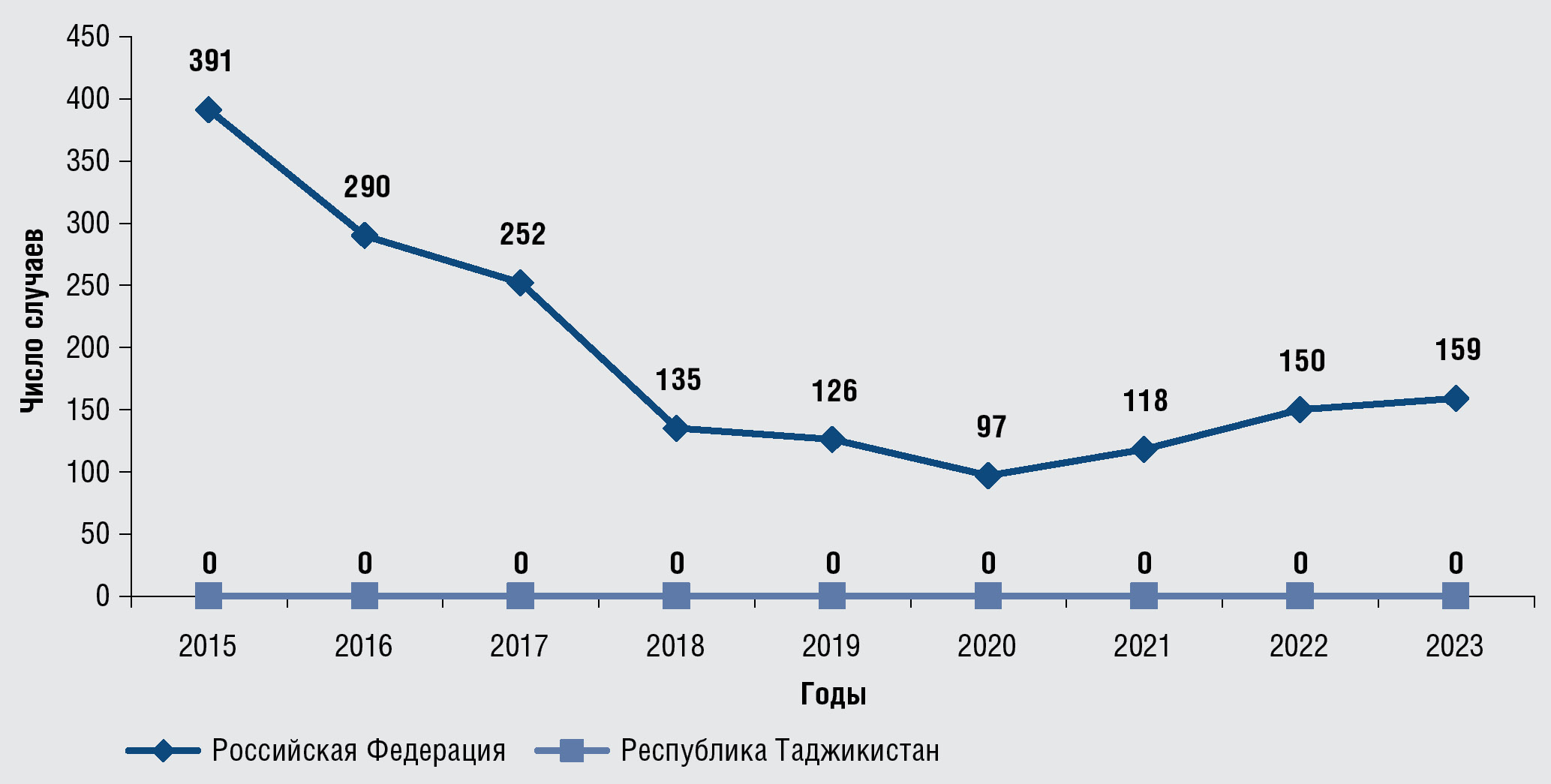 Рис. 4. Число случаев врожденного сифилиса в Российской Федерации и Республике Таджикистан, 2015–2023 гг., абс.