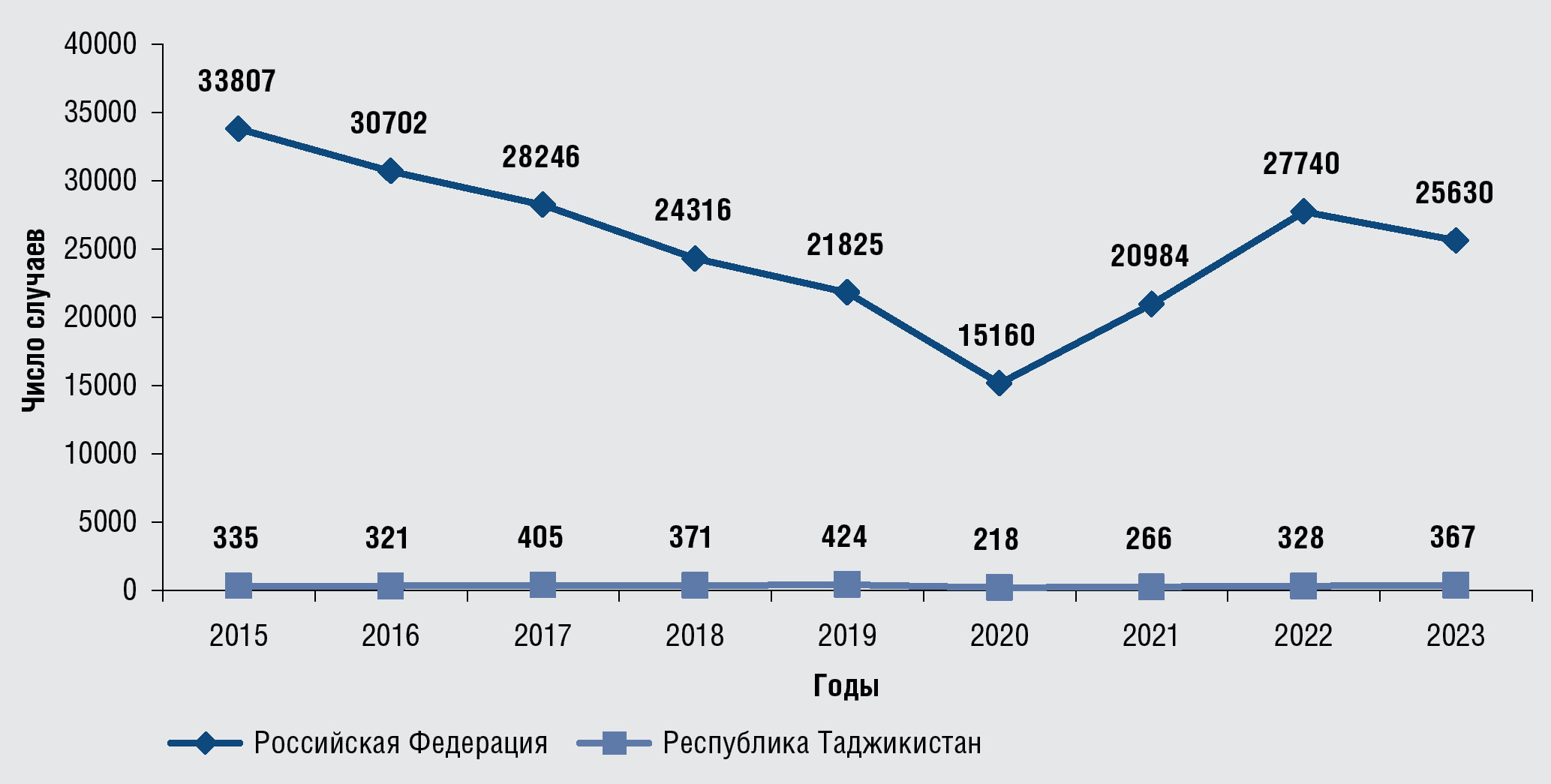 Рис. 3. Число случаев сифилиса в группе лиц в возрасте 18 лет и старше в Российской Федерации и Республике Таджикистан, 2015–2023 гг., абс.