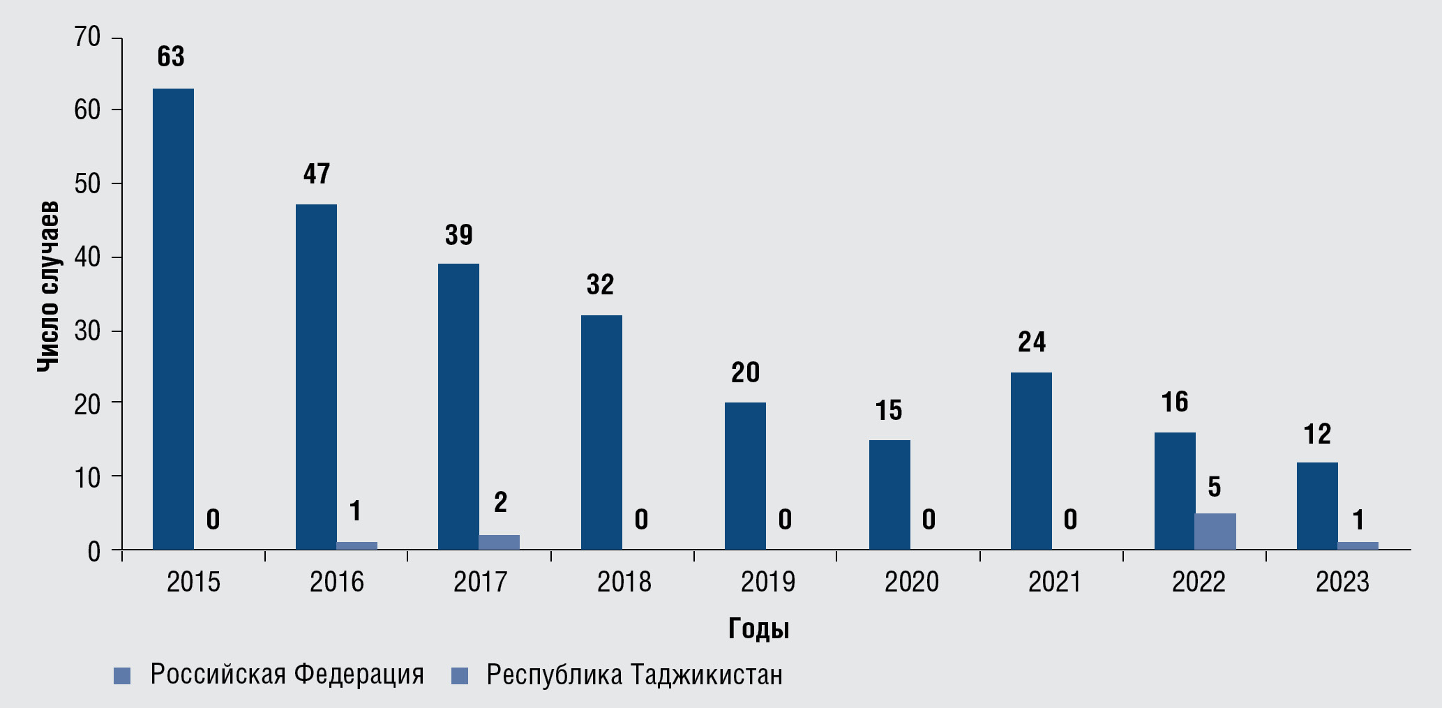 Fig. 4. Number of cases of congenital syphilis in the Russian Federation and the Republic of Tajikistan, 2015–2023, abs.