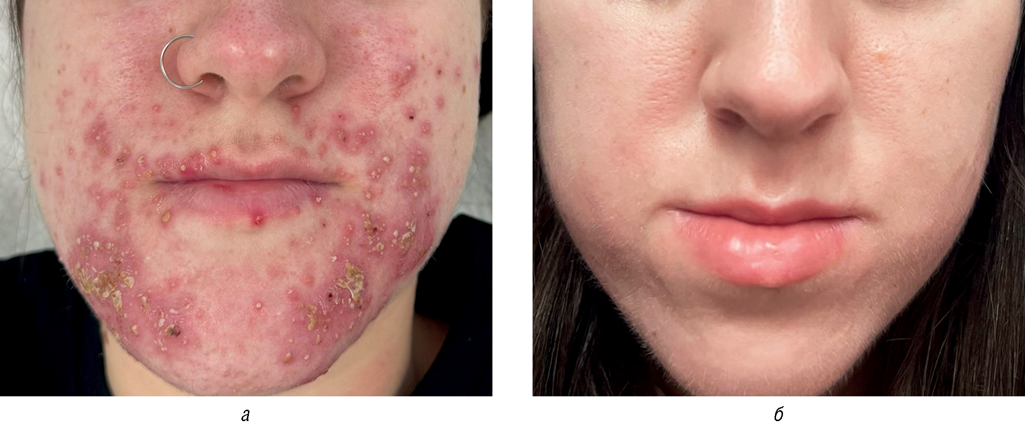 Рис. 2. Пациентка с акне тяжелой степени: а — до лечения; б — после курса лечения изотретиноином