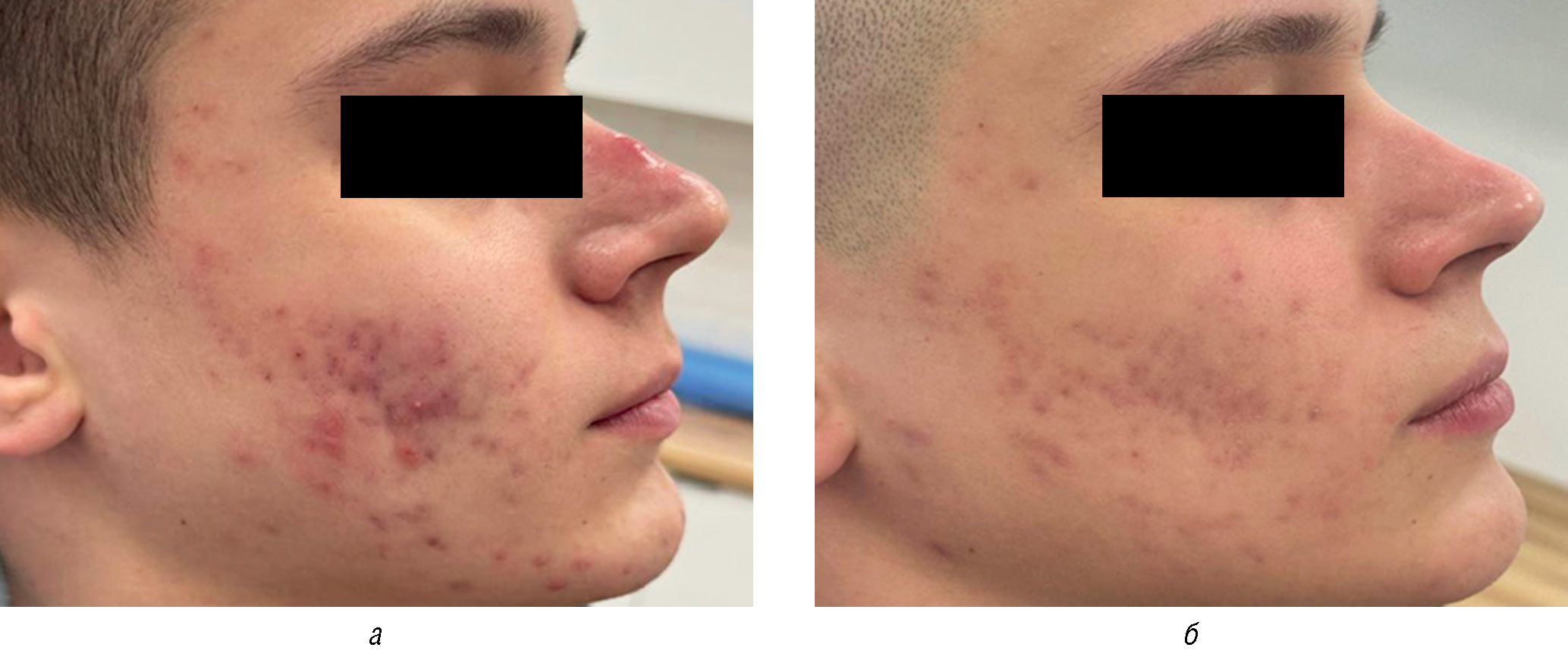 Рис. 3. Пациент с акне средней степени: а — до лечения; б — после курса лечения изотретиноином