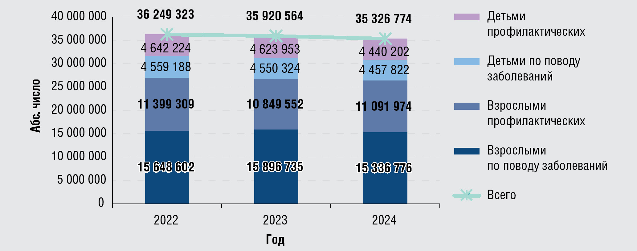 В 2024 г. продолжилось сокращение числа посещений врачей-дерматовенерологов. За трехлетний период общее число посещений сократилось на 2,5% — с 36 249 323 в 2022 г. до 35 326 774 в 2024 г. Показатель объема амбулаторной помощи по профилю «дерматовенерология» снизился на 2,9% — с 249,0 на 1000 населения в 2022 г. до 241,7 на 1000 населения в 2024 г.