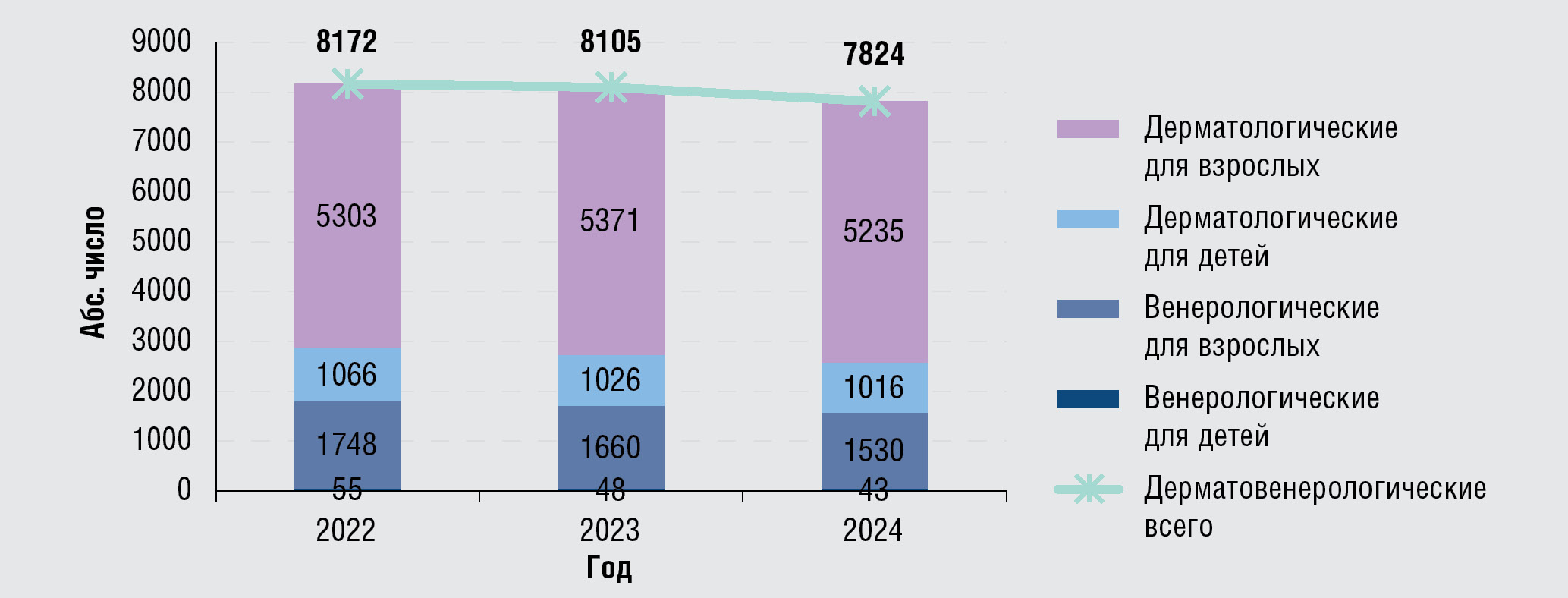 За рассматриваемый период число дерматовенерологических отделений было сокращено на 3 (со 104 в 2022 г. до 101 в 2024 г.), число дерматовенерологических кабинетов — на 52 (с 3003 в 2022 г. до 2951 в 2024 г.) [3, 4] (рис. 1).