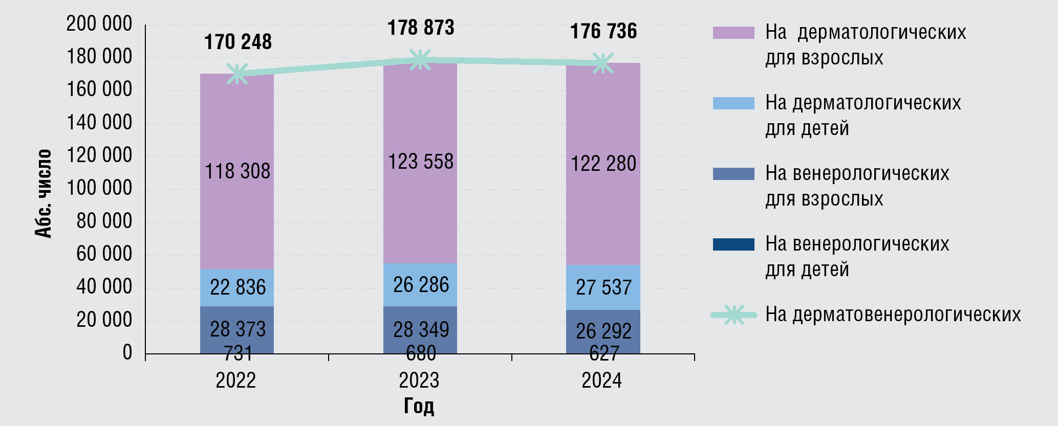 Число больных, пролеченных в 2024 г. на круглосуточных дерматовенерологических койках, составило 176 736, что на 3,8% больше, чем в 2022 г. (170 248), однако на 1,2% меньше, чем в 2023 г. (178 873).