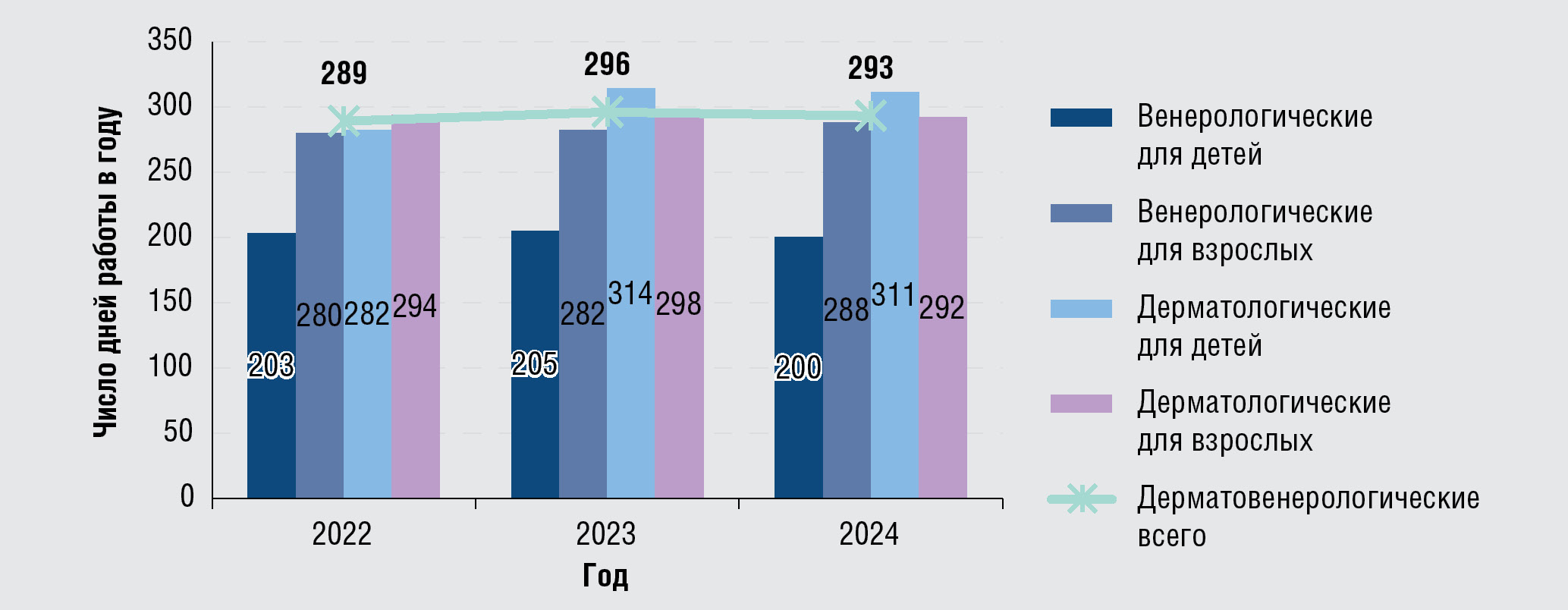 Показатель работы дерматовенерологической койки дневных стационаров медицинских организаций, оказывающих медицинскую помощь в стационарных условиях, в 2024 г. составил 279 дней, вернувшись к уровню 2022 г. (278 дней) после снижения в 2023 г. до 267 дней [1, 3].