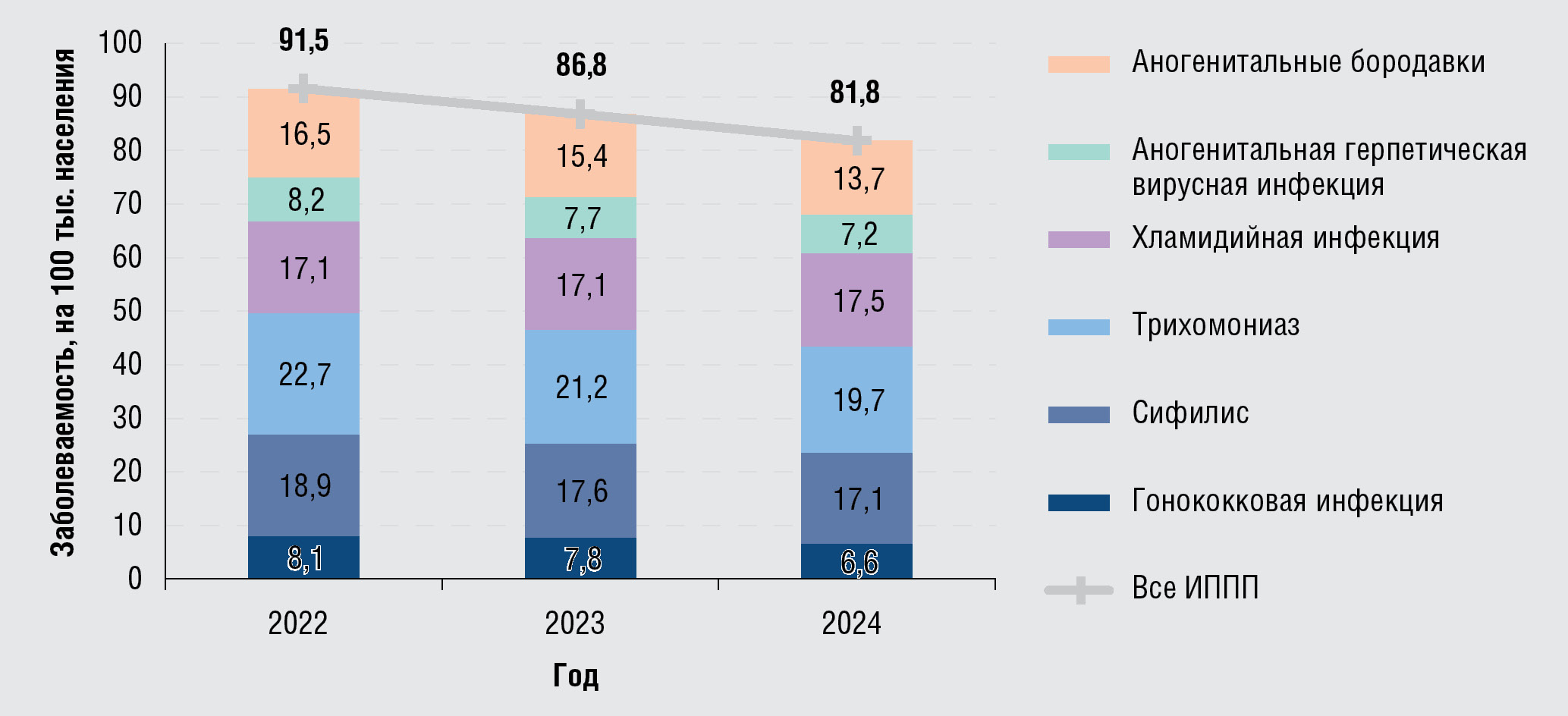 За рассматриваемый период 2022–2024 гг. заболеваемость инфекциями, передаваемыми половым путем, в Российской Федерации снизилась на 10,6%. Наиболее интенсивным было снижение заболеваемости гонококковой инфекцией (на 18,5%, с 8,1 на 100 тыс. населения в 2022 г. до 6,6 на 100 тыс. населения в 2024 г.) и аногенитальными (венерическими) бородавками (на 17,0%, с 16,5 до 13,7 на 100 тыс. населения соответственно). Заболеваемость трихомониазом за период 2022–2024 гг. снизилась на 13,2% (с 22,7 до 19,7 на 100 тыс. населения), аногенитальной герпетической вирусной инфекцией — на 12,2% (с 8,2 до 7,2 на 100 тыс. населения), сифилисом — на 9,5% (с 18,9 до 17,1 на 100 тыс. населения). Уровень заболеваемости хламидийной инфекцией в 2024 г. на 2,3% выше, чем в 2022 и 2023 гг. (17,5 в 2024 г. по сравнению с 17,1 на 100 тыс. населения в 2022 и 2023 гг.).