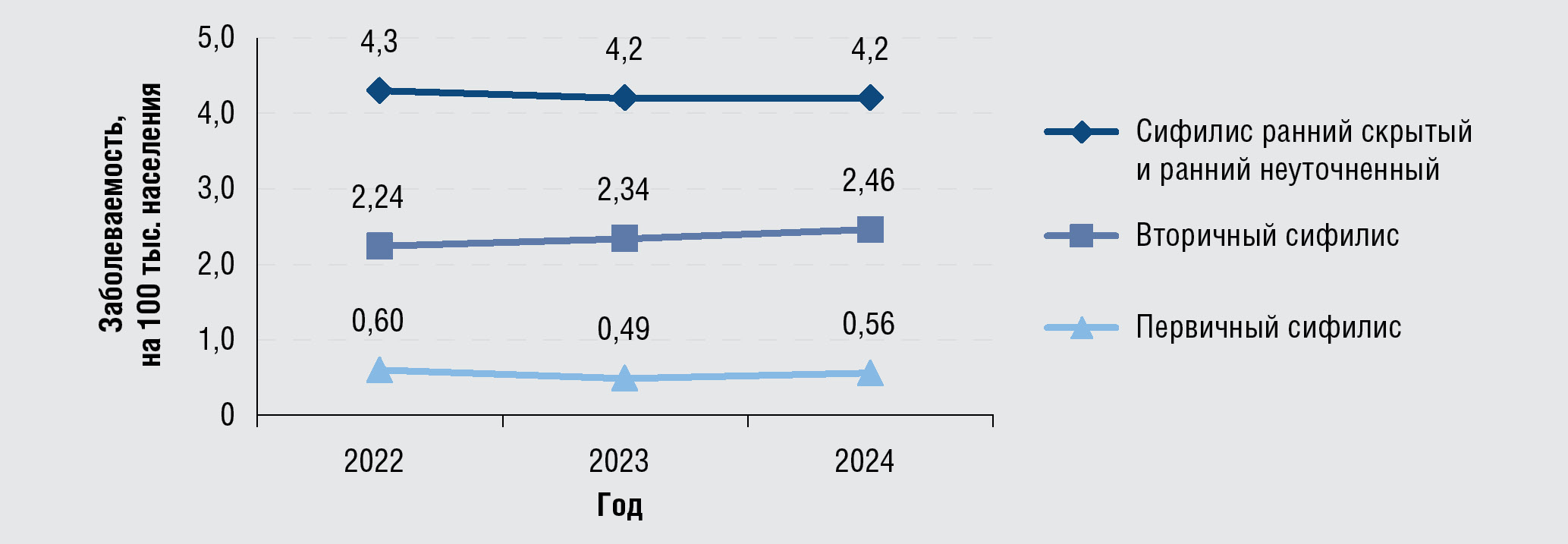 Рис. 10. Заболеваемость различными формами сифилиса в Российской Федерации, 2022–2024 гг.