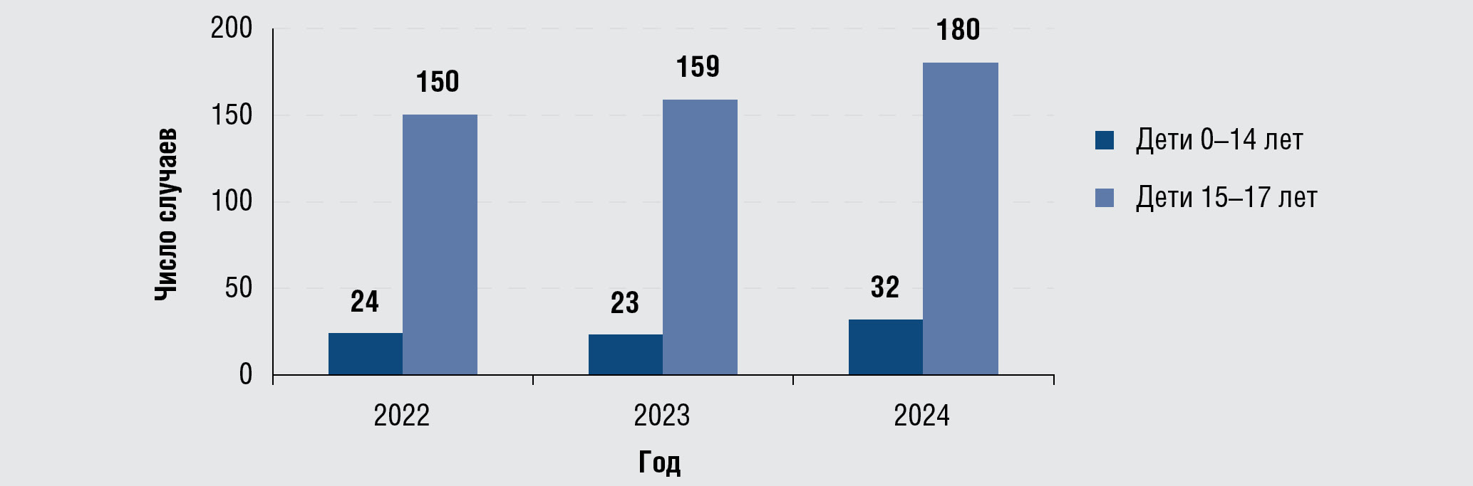Рис. 14. Число зарегистрированных случаев приобретенного сифилиса среди детей 0–14 лет и 15–17 лет в Российской Федерации, 2022–2024 гг.