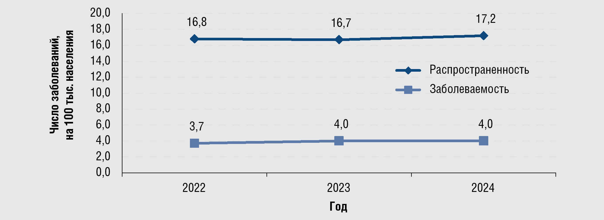 Fig. 16. Prevalence and incidence of atopic dermatitis in the overall population in the Russian Federation, 2022–2024