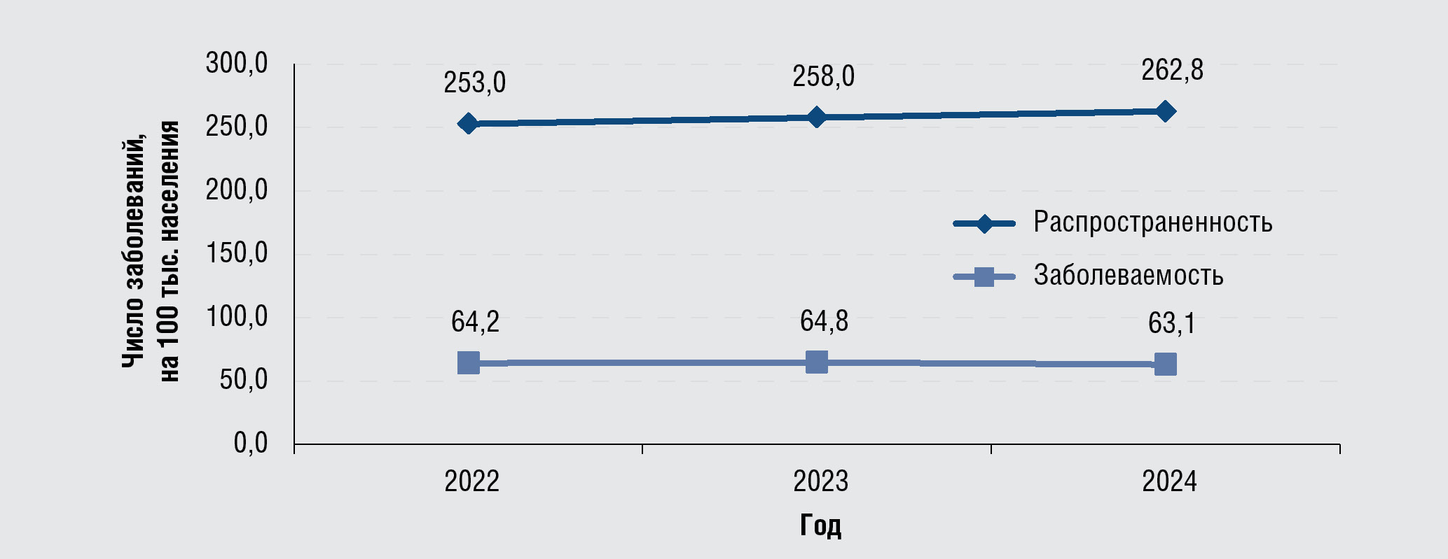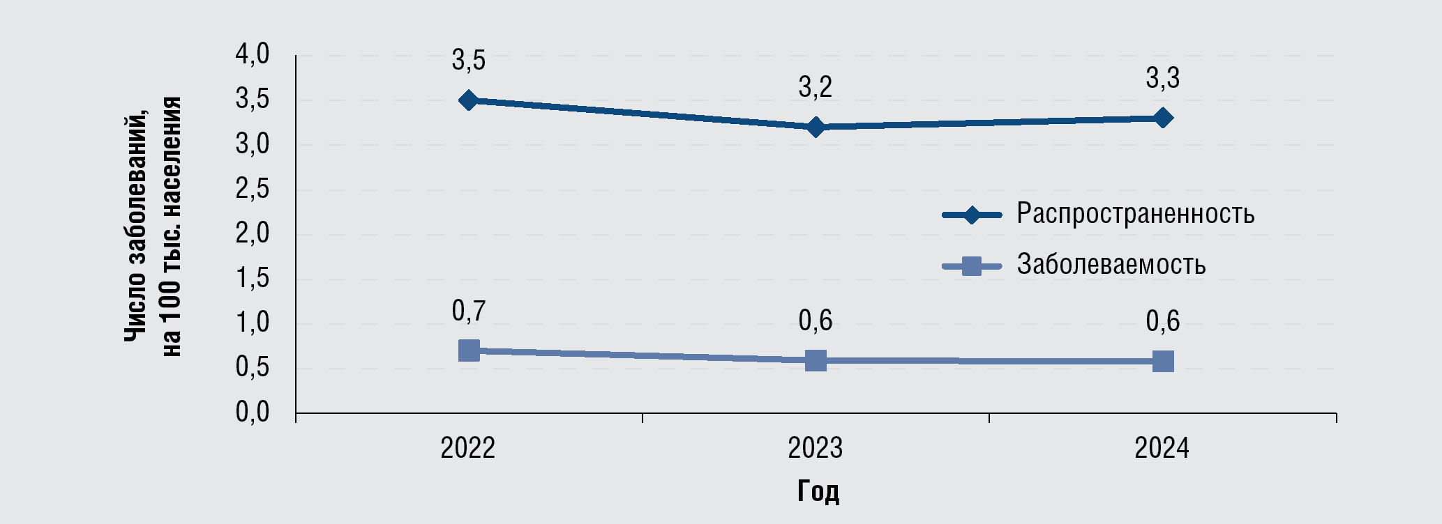 Показатель обеспеченности населения Российской Федерации врачами-дерматовенерологами — физическими лицами на занятых должностях, составлявший в 2022 г. 0,51 на 10 тыс. населения, в 2023 и 2024 гг. находился на уровне 0,50 на 10 тыс. населения [1, 3].