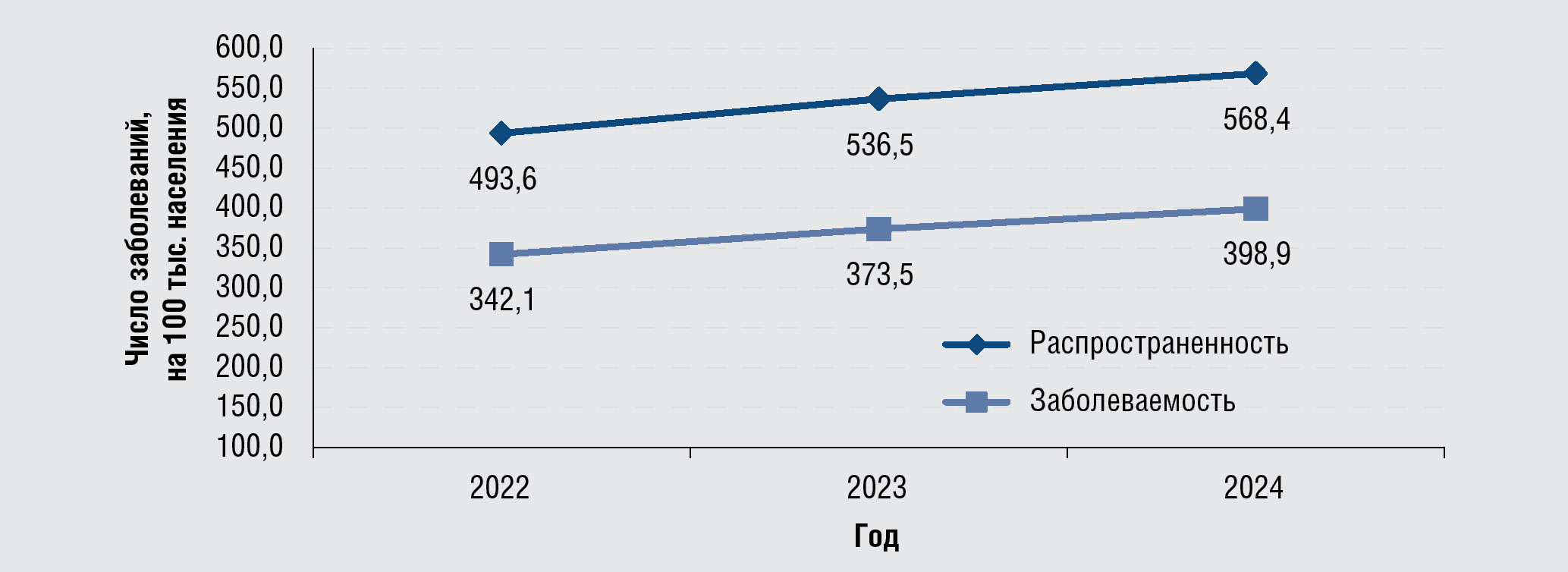 В 2022–2024 гг. отмечается рост показателей распространенности и заболеваемости всего населения другими дерматитами (экземой; L30): распространенность увеличилась на 15,2% — с 493,6 на 100 тыс. населения в 2022 г. до 568,4 на 100 тыс. населения в 2024 г.; заболеваемость увеличилась на 16,6% — соответственно с 342,1 до 398,9 на 100 тыс. населения [1, 3] (рис. 21).