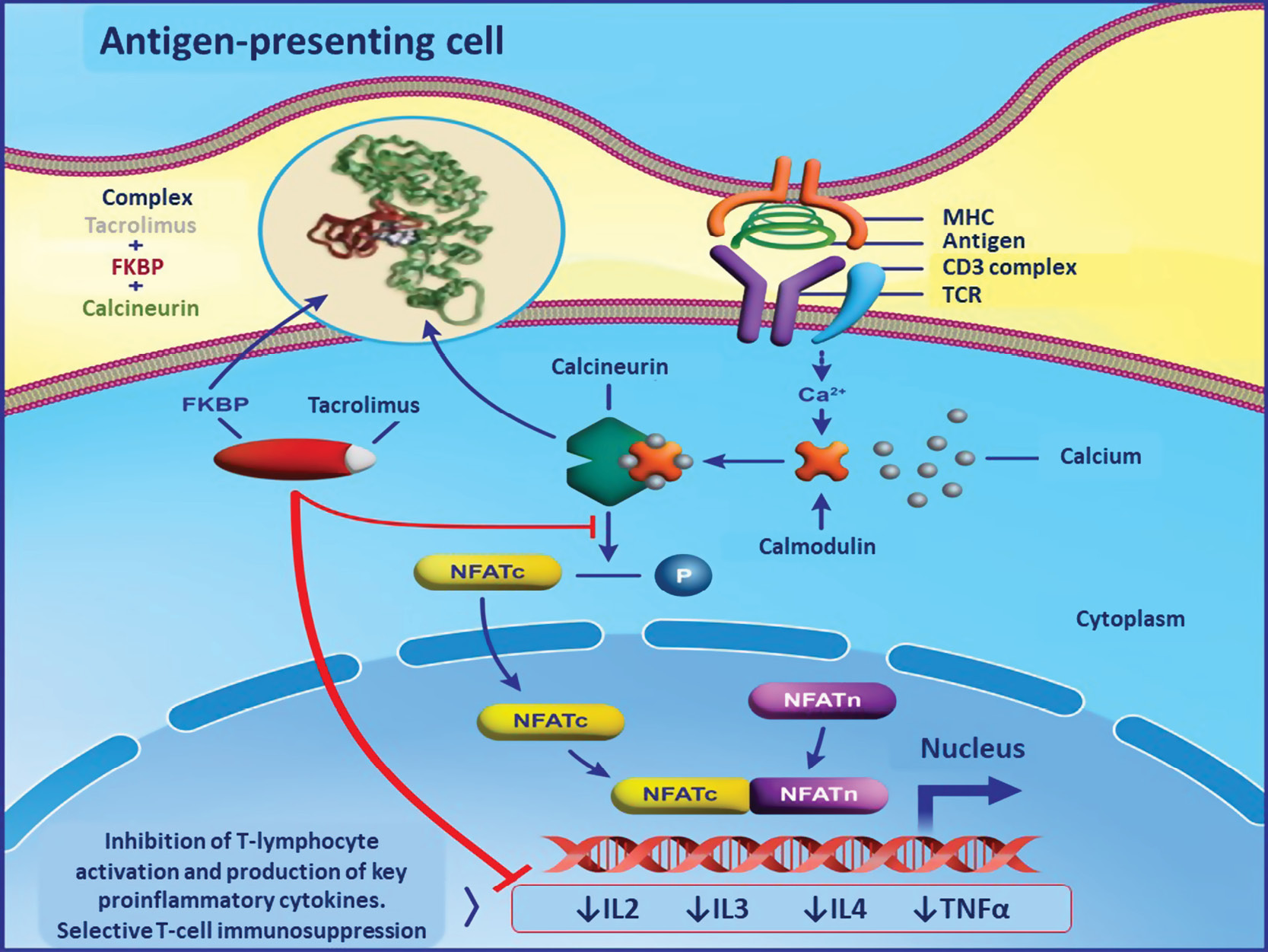 From the perspective of human physiology and the pharmacodynamics of calcineurin inhibitors class, the most important function of this phosphatase is its role in the immune response. Activation of the T-cell receptor following antigen presentation to a naive T-lymphocyte by an antigen-presenting cell triggers a signaling cascade that activates phospholipase C-gamma, which hydrolyzes phosphatidylinositol-4,5-bisphosphate to form the secondary messengers, diacylglycerol and inositol-1,4,5-trisphosphate; the latter binds to receptors located on the endoplasmic reticulum and causes the release of calcium ions into the cytoplasm. Increase in cytoplasmic calcium concentration leads to calcineurin activation — a complex “calcineurin + calcium + calmodulin” is formed, which causes dephosphorylation of the cytoplasmic fragment of transcription factors belonging to the NFAT (Nuclear Factor of Activated T-cells) family. It should be noted that the NFAT family of factors in its hyperphosphorylated form is the main substrate for calcineurin in immune cells, as well as cardiomyocytes and skeletal myocytes. Dephosphorylation of NFAT causes conformational changes that enable translocation of these factors into the cell nucleus, and also increases their affinity for certain DNA sequences. After that, NFAT translocates into the nucleus, where it interacts with regulatory elements, stimulating gene expression of key cytokines and chemokines for the T-cell immune response, including IL-2,3,4,5,13,17, IFN-γ, TNF-α, etc. Continuous calcineurin activity is required for NFAT to remain in an activated state; decreased calcium levels in the cytoplasm (e.g., upon cessation of antigenic stimulation) or pharmacologic inhibition of calcineurin leads to rephosphorylation of NFAT and its release from the cell nucleus back into the cytoplasm [19–23].