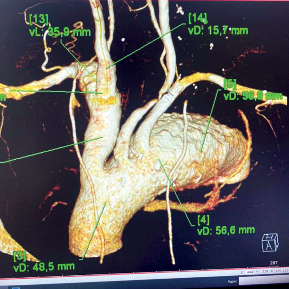 По данным мультиспиральной компьютерной томографии — панаортографии грудного и брюшного отдела аорты: плотное контрастирование аорты и ее ветвей, стенки аорты утолщены, с очагами кальциноза. Грудная аорта: размеры аорты на уровне фиброзного кольца — 28,9 мм, на уровне синусов Вальсальвы — до 39 мм, на уровне синотубулярного соединения — до 38 мм (сглажен), восходящий отдел аорты на уровне ствола легочной артерии — до 44 мм. Дуга аорты размером перед брахиоцефальным стволом — до 49 мм, между устьями брахиоцефального ствола и левой общей сонной артерии — до 48 мм, между устьями левой общей сонной артерии и левой подключичной артерии — до 48 мм, сразу после левой подключичной артерии отмечается расширение перешейка аорты до 68 мм с пристеночным тромбированием просвета (размер просвета — 50 мм). Протяженность расширения перешейка и нижнего отдела аорты — 148 мм с максимальным наружным диаметром 80 мм, просвет — 49 мм. Пристеночно отмечается практически циркулярный тромб толщиной максимально до 19 мм, достоверных признаков расслоения интимы не выявлено. Брахиоцефальные артерии из-за удлинения дуги аорты смещены кпереди: брахиоцефальный ствол расширен до 26 мм, на уровне деления на правую общую сонную артерию и правую подключичную артерию отмечается расширение до 32 мм (просвет устья правой общей сонной артерии — 15 мм, размер устья правой подключичной артерии — 19 мм) с циркулярным пристеночным тромбом (стенка в этом месте утолщена до 3,3 мм), циркулярный тромб распространяется на правую общую сонную артерию (протяженность — 32 мм), диаметр устья правой общей сонной артерии — 30 мм, просвет — 14 мм, далее размер устья правой общей сонной артерии — 13 мм. Расширение брахиоцефального ствола сдавливает правую брахиоцефальную вену и правую яремную, что, возможно, нарушает отток. Левая общая сонная артерия — 13 мм, левая подключичная артерия — 13 мм. Брюшная аорта: размером на уровне устья чревного артериального ствола — 26 мм, на уровне устья брыжеечной артерии — 24 мм, на уровне устья почечных артерий — 20 мм, в инфраренальном отделе — 24 мм (несколько расширена), в терминальном отделе — 18 мм. Общие подвздошные артерии не расширены — до 11 мм. Внутренняя подвздошная артерия слева: отмечается выраженное сужение просвета на протяжении 17 мм за счет бляшки, диаметр просвета — до 1–2 мм (выраженный стеноз), наружный диаметр — 14 мм. Средостение: определяются увеличенные лимфатические узлы в обоих корнях легких. Сердце: расположено типично, несколько увеличено в размере. Перикард уплотнен, в карманах перикарда определяется небольшое количество жидкости. В обоих плевральных полостях отмечается жидкость.
